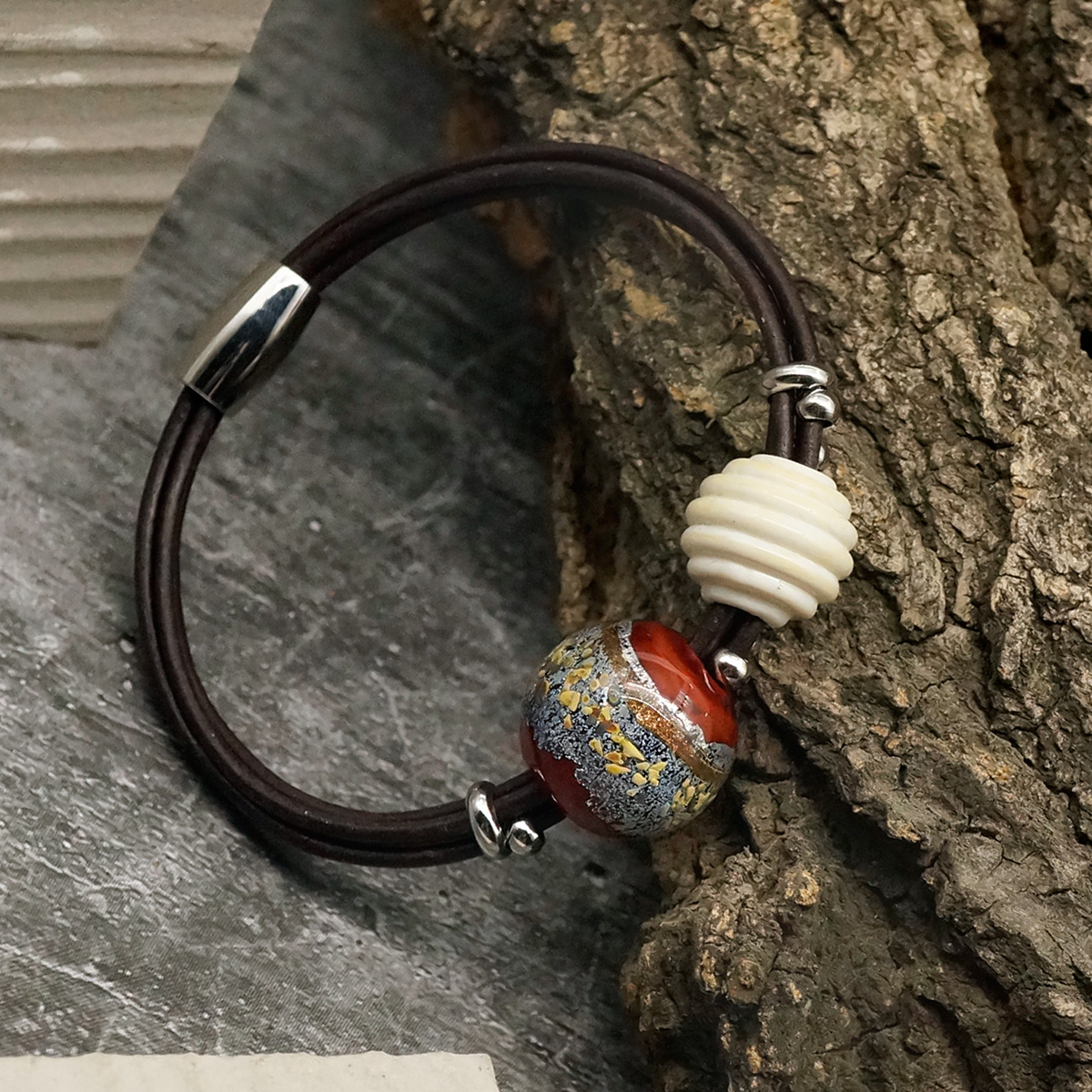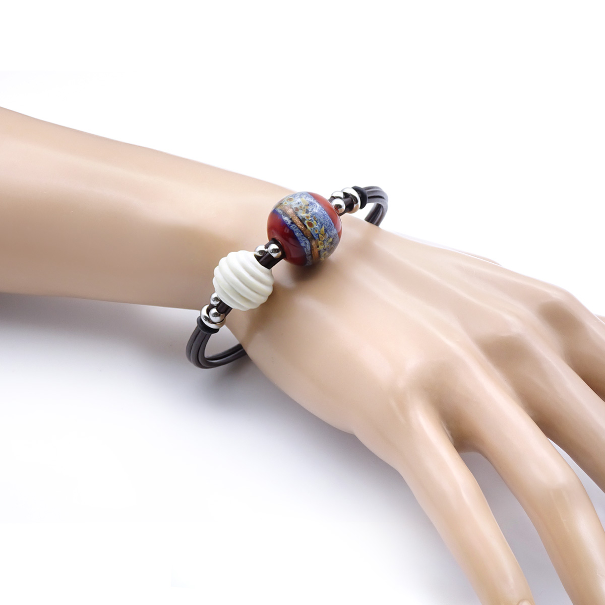 Браслет изготовлен из муранского стекла, натуральной кожи и гипоаллергенной ювелирной стали, что очень важно для людей с чувствительной кожей. Металл не темнеет и не подвергается воздействиям окружающей среды, надолго обеспечивая красивый внешний вид изделия. Крепкий магнитный замок надежно фиксируется на запястье. Ширина браслета - 0,5 см. Диаметр стеклянных шариков - 1,5 и 1,8 см. Вес -18 гр.