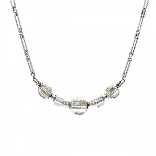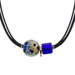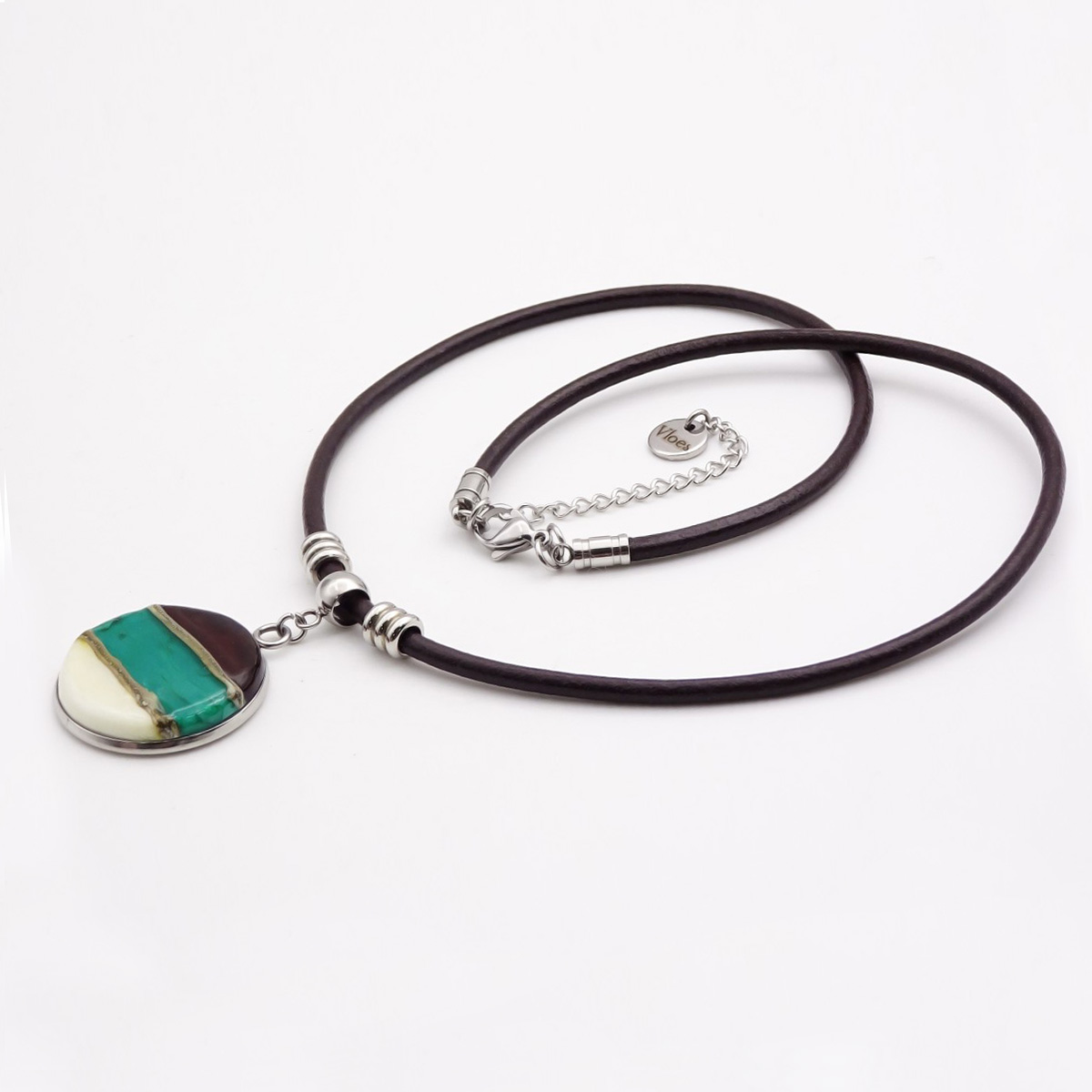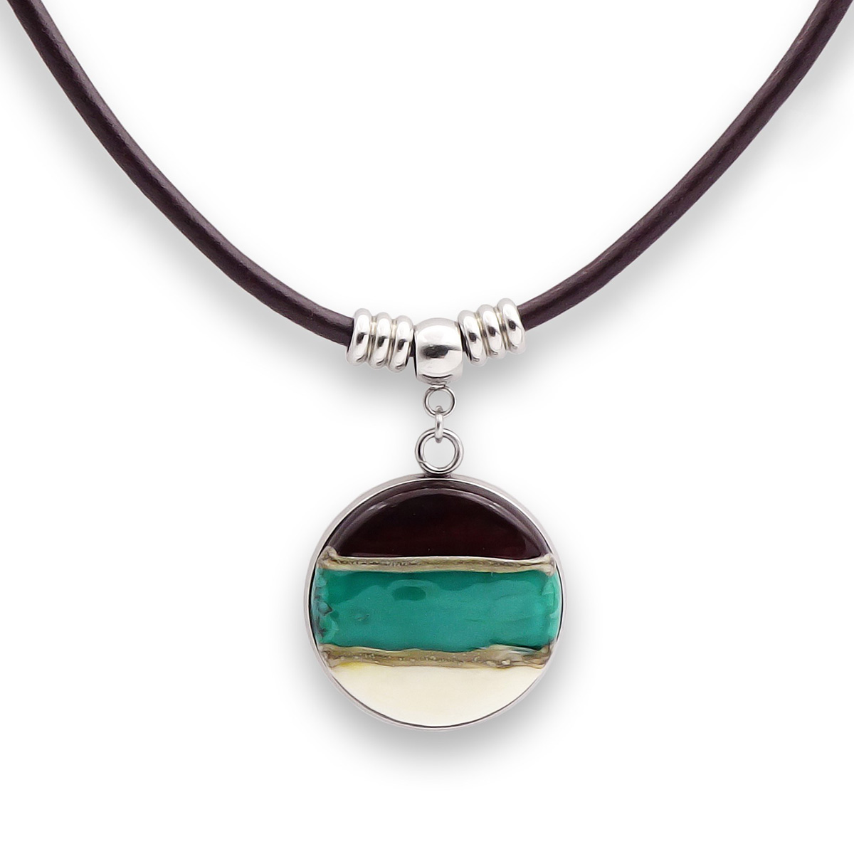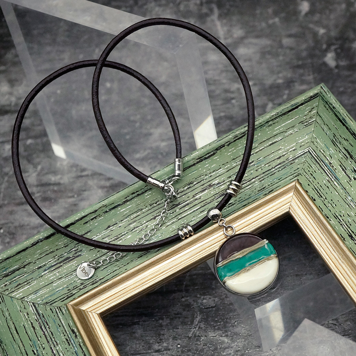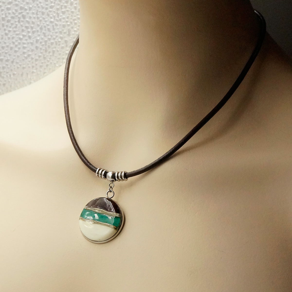 Колье изготовлено из натуральной кожи, муранского стекла и гипоаллергенной ювелирной стали, что очень важно для людей с чувствительной кожей. Металл не темнеет и не подвергается воздействиям окружающей среды, надолго обеспечивая красивый внешний вид изделия. Длина колье - 46 см + 5 см. удлиняющая цепочка. Диаметр стеклянного элемента - 2,5 см. Вес - 15 гр.