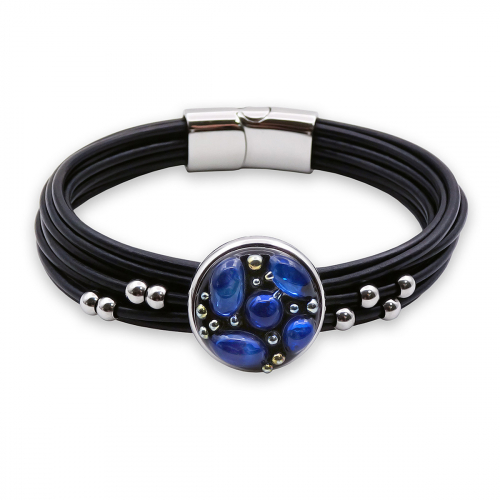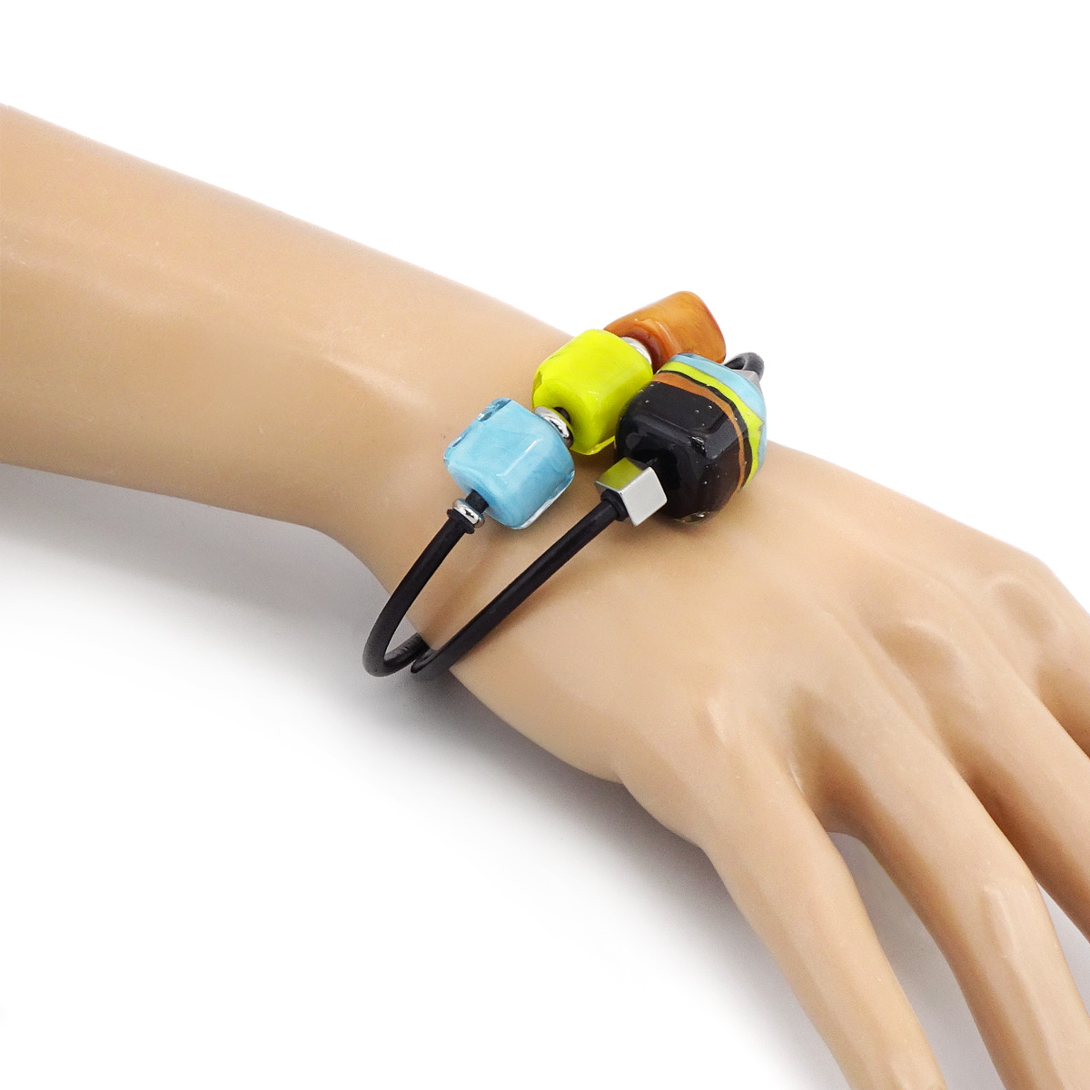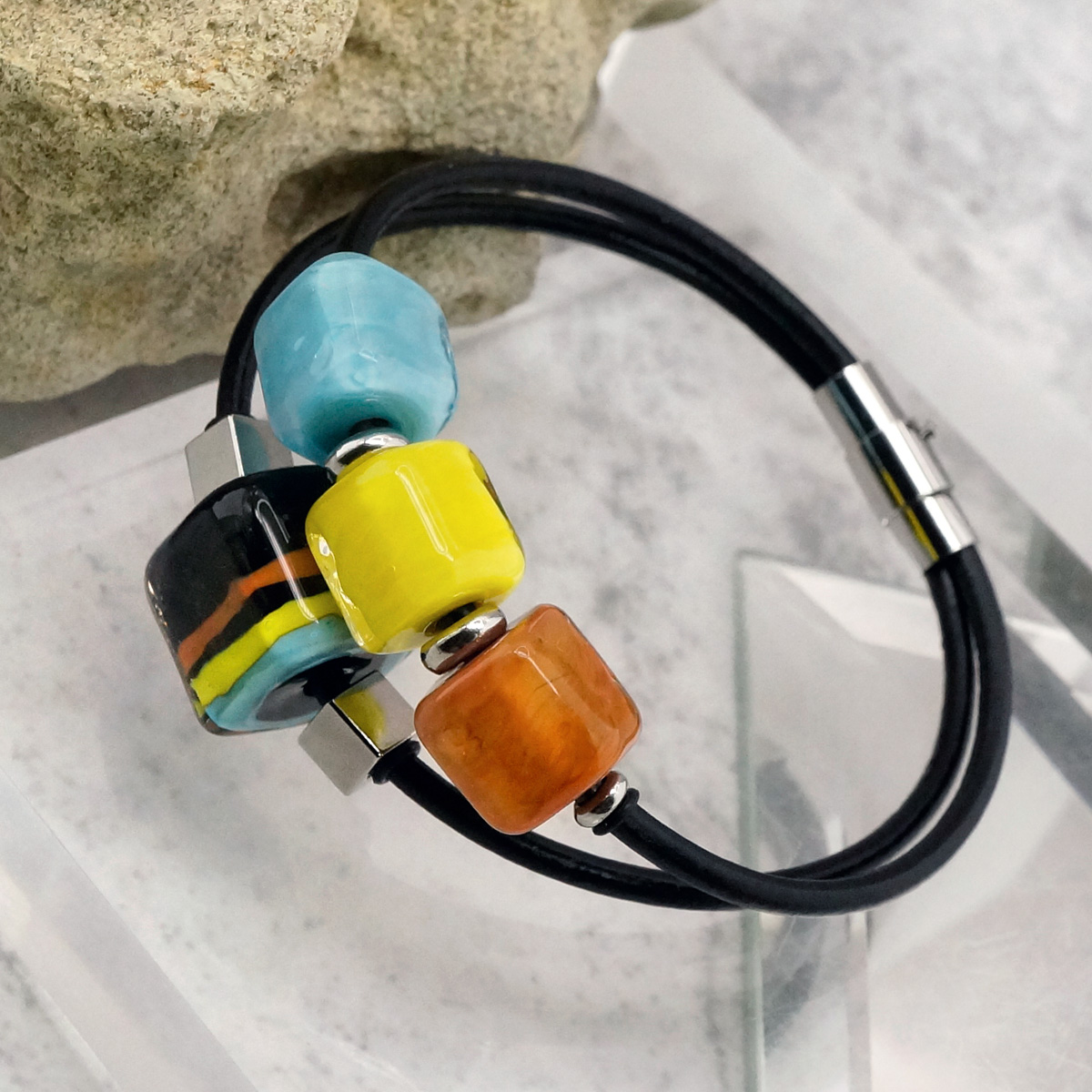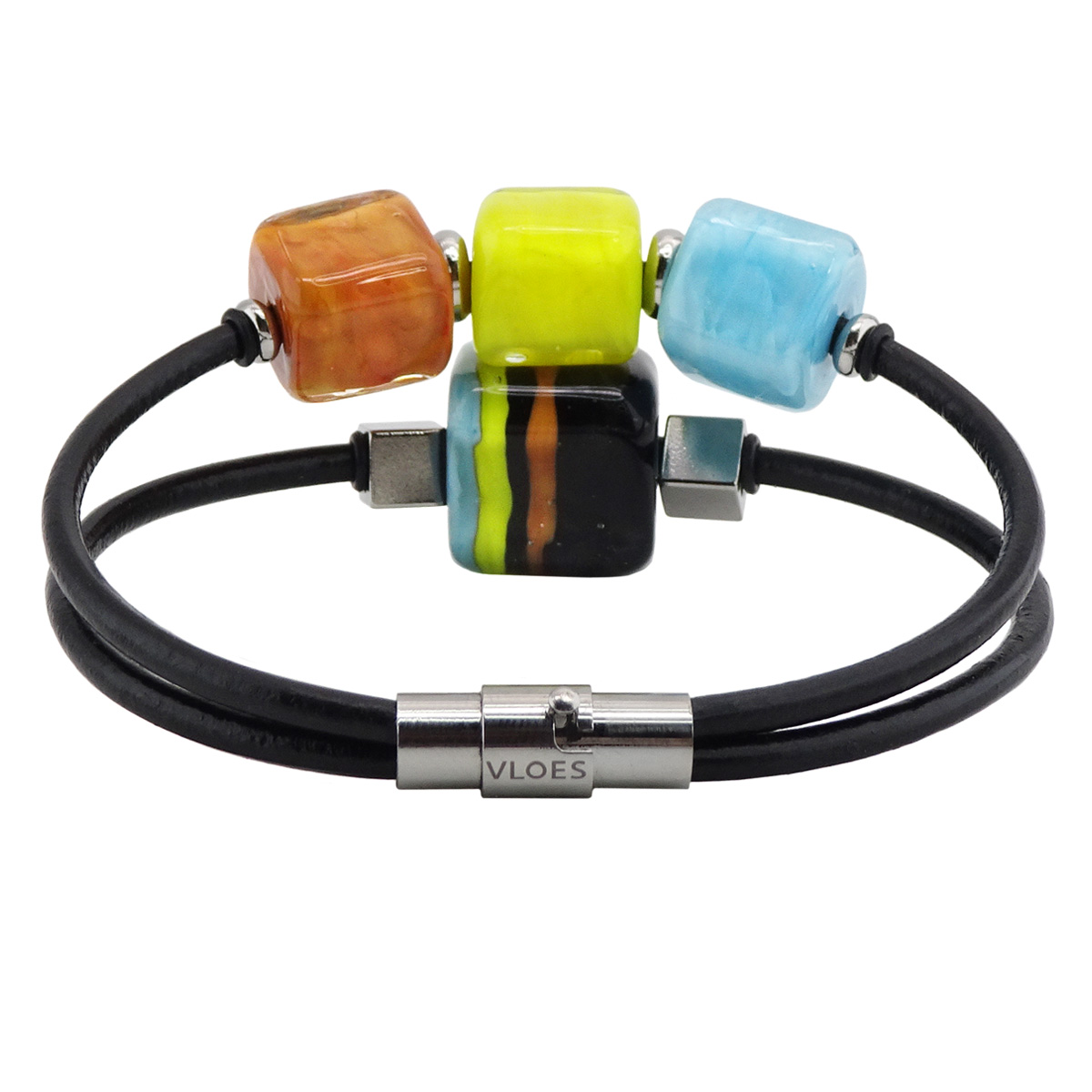 Браслет изготовлен из муранского стекла, натуральной кожи и гипоаллергенной ювелирной стали, что очень важно для людей с чувствительной кожей. Металл не темнеет и не подвергается воздействиям окружающей среды, надолго обеспечивая красивый внешний вид изделия. Крепкий магнитный замок надежно фиксируется на запястье. Ширина браслета - 0,5 см. Размер стеклянных элементов 1,4*1,4 и 1*1 см. Вес - 27 гр.