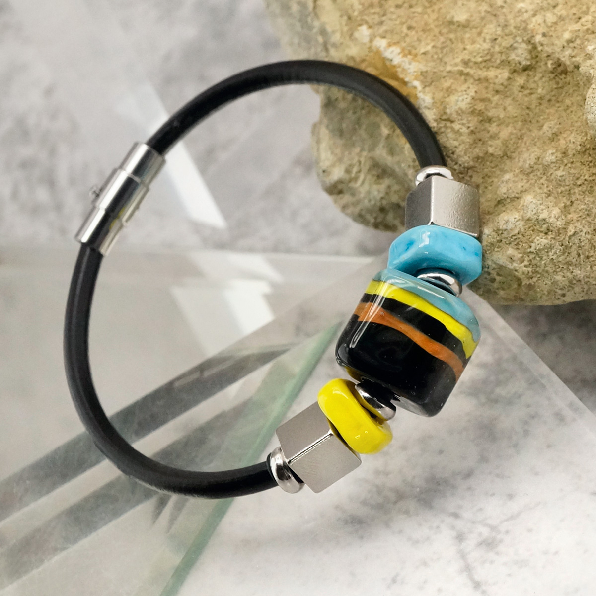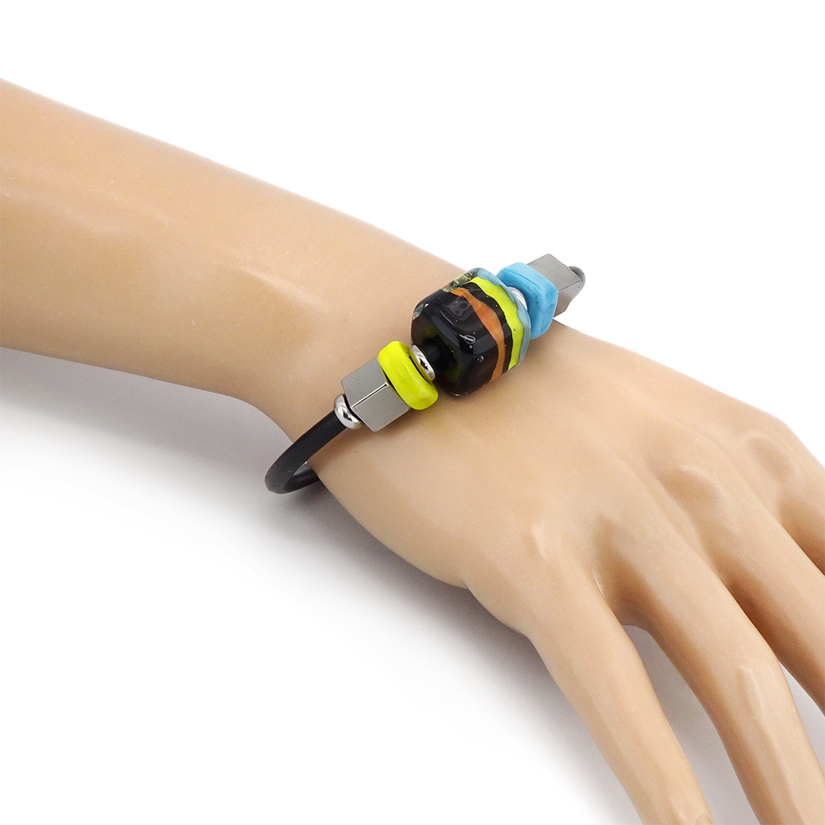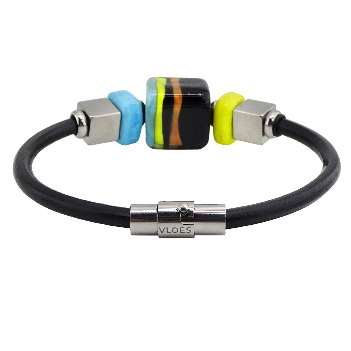 Браслет изготовлен из муранского стекла, натуральной кожи и гипоаллергенной ювелирной стали, что очень важно для людей с чувствительной кожей. Металл не темнеет и не подвергается воздействиям окружающей среды, надолго обеспечивая красивый внешний вид изделия. Крепкий магнитный замок надежно фиксируется на запястье. Ширина браслета - 0,5 см. Размер стеклянных элементов 1,4*1,4 и 0,5*1. Вес - 25 гр.