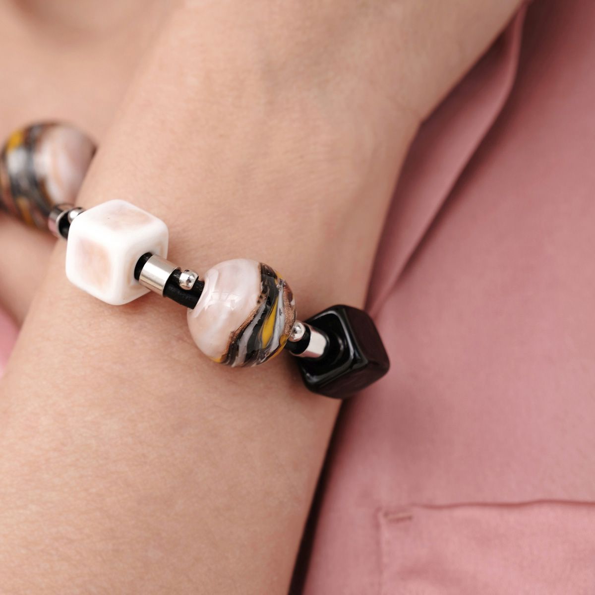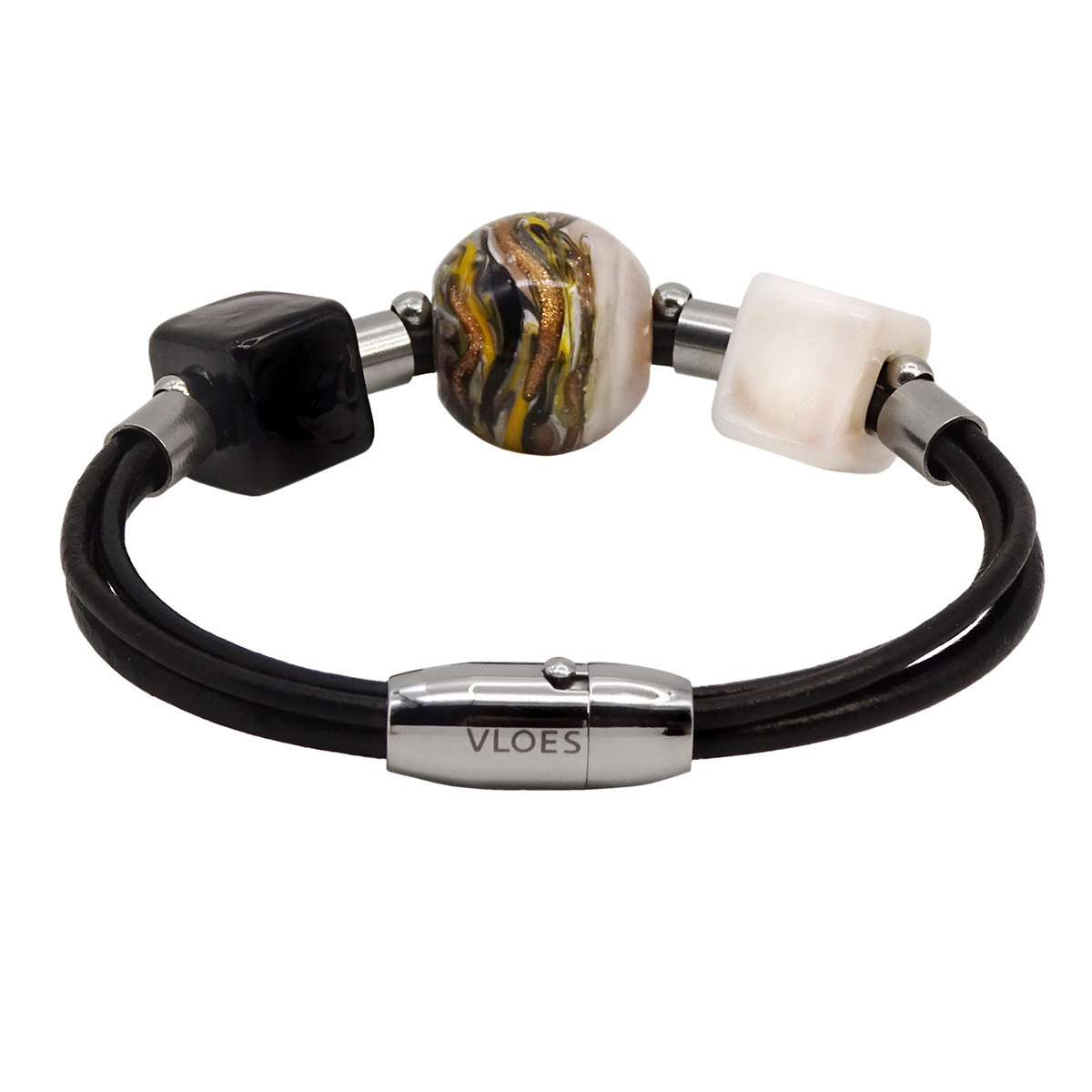 Браслет изготовлен из муранского стекла, натуральной кожи и гипоаллергенной ювелирной стали, что очень важно для людей с чувствительной кожей. Металл не темнеет и не подвергается воздействиям окружающей среды, надолго обеспечивая красивый внешний вид изделия. Крепкий магнитный замок надежно фиксируется на запястье. Ширина браслета - 0,5 см. Размер стеклянных кубов - 1,2*1,2 см. Диаметр шара - 1,5 см. Вес - 25 гр.