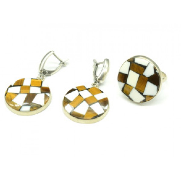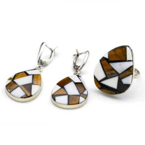 Кольцо и серьги " Мозаика" из тигрового глаза и кахолонга