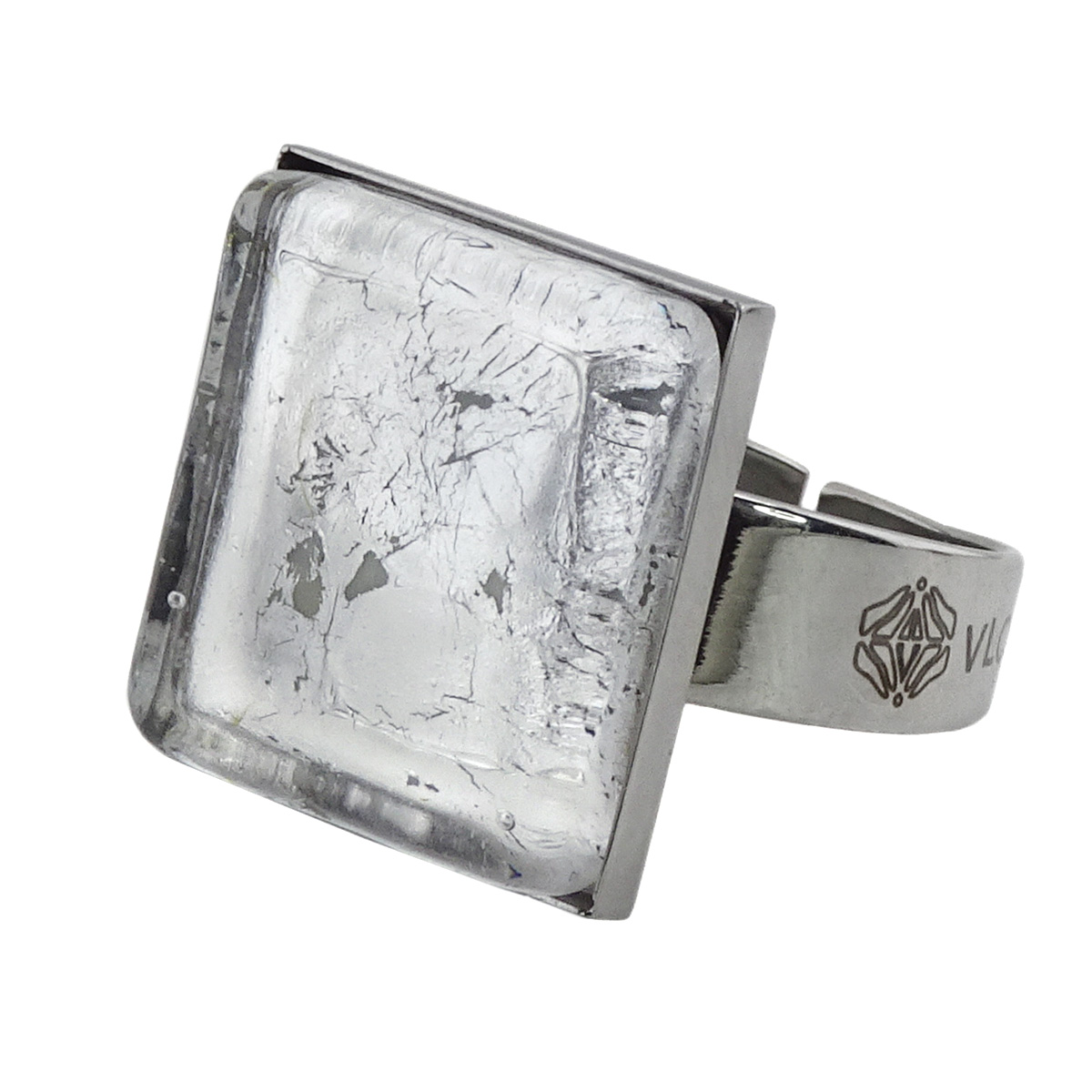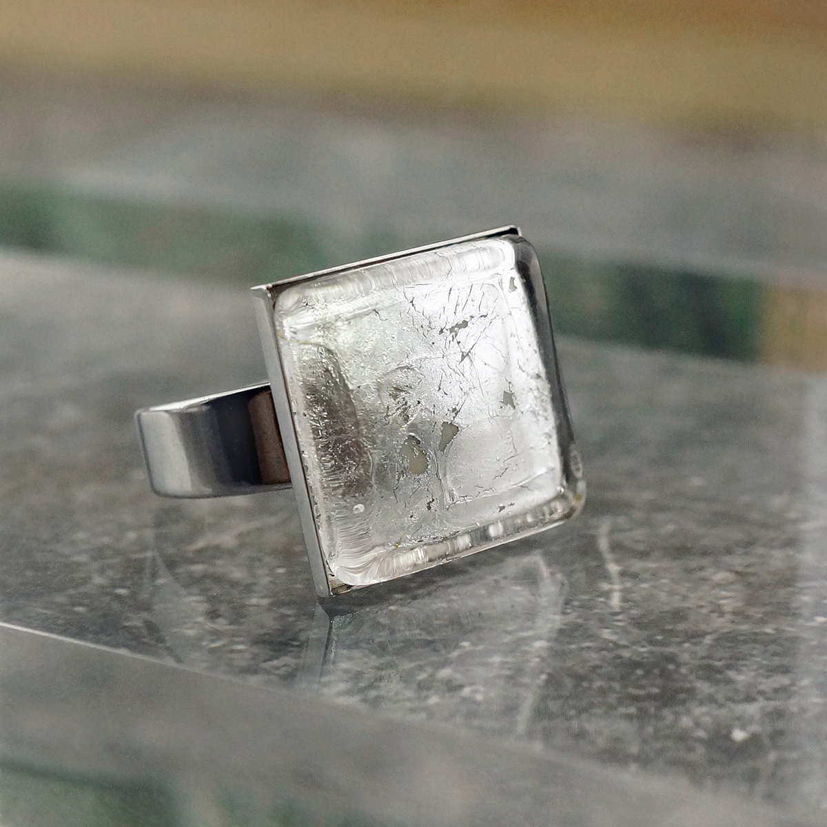 Кольцо изготовлено из муранского стекла и гипоаллергенной ювелирной стали, что очень важно для людей с чувствительной кожей. Металл не темнеет и не подвергается воздействиям окружающей среды, надолго обеспечивая красивый внешний вид изделия. Размер стеклянного элемента - 2,3x2,3 см. Кольцо безразмерное, регулируется с 16 до 19 размера. Вес - 5  гр.