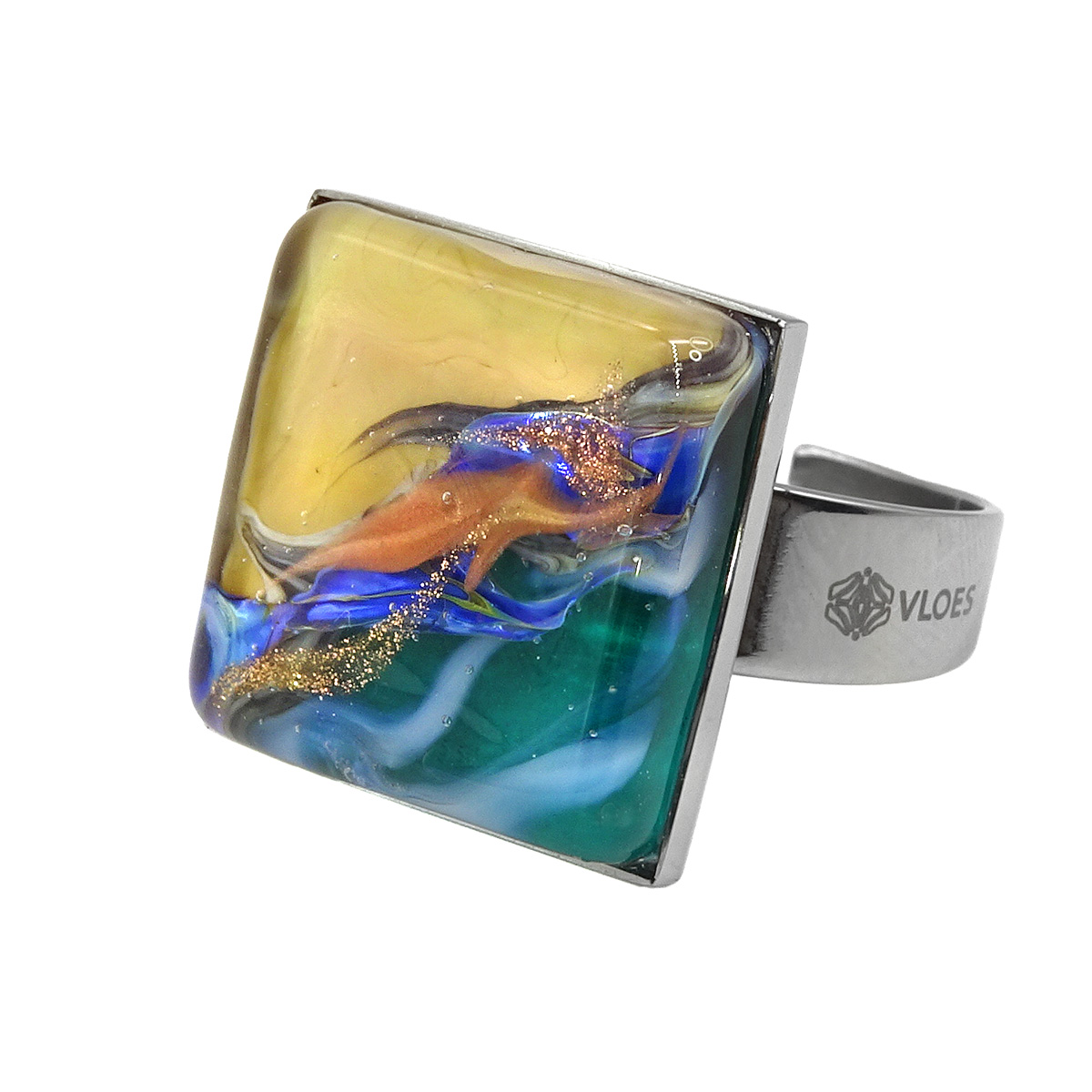 Кольцо изготовлено из муранского стекла и гипоаллергенной ювелирной стали, что очень важно для людей с чувствительной кожей. Металл не темнеет и не подвергается воздействиям окружающей среды, надолго обеспечивая красивый внешний вид изделия. Размер стеклянного элемента - 1,6*1,6 см. Кольцо безразмерное, регулируется с 16 до 19 размера. Вес - 5 гр.