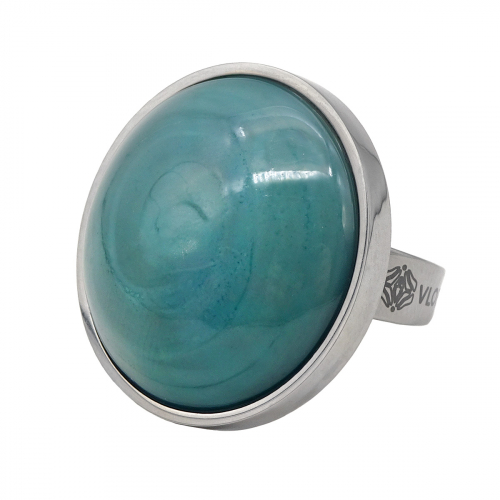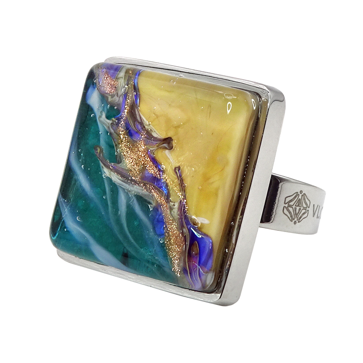 Кольцо изготовлено из муранского стекла и гипоаллергенной ювелирной стали, что очень важно для людей с чувствительной кожей. Металл не темнеет и не подвергается воздействиям окружающей среды, надолго обеспечивая красивый внешний вид изделия. Размер стеклянного элемента - 2,2*2,2 см. Кольцо безразмерное, регулируется с 16 до 19 размера. Вес - 16 гр.