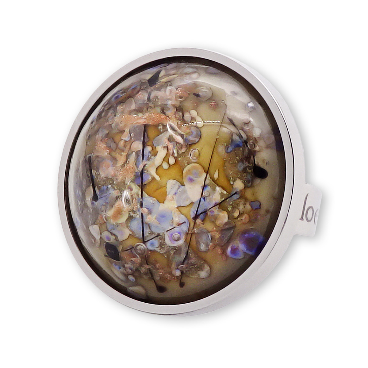 Кольцо изготовлено из муранского стекла и гипоаллергенной ювелирной стали, что очень важно для людей с чувствительной кожей. Металл не темнеет и не подвергается воздействиям окружающей среды, надолго обеспечивая красивый внешний вид изделия. Диаметр стеклянного элемента - 2,5 см. Кольцо безразмерное, регулируется с 16 до 19 размера. Вес - 12 гр.