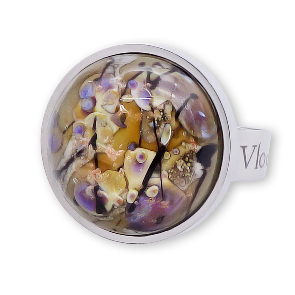 Кольцо изготовлено из муранского стекла и гипоаллергенной ювелирной стали, что очень важно для людей с чувствительной кожей. Металл не темнеет и не подвергается воздействиям окружающей среды, надолго обеспечивая красивый внешний вид изделия. Диаметр стеклянного элемента - 2 см. Кольцо безразмерное, регулируется с 16 до 19 размера. Вес - 8 гр.