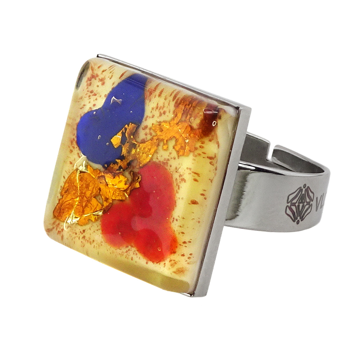 Кольцо изготовлено из муранского стекла и гипоаллергенной ювелирной стали, что очень важно для людей с чувствительной кожей. Металл не темнеет и не подвергается воздействиям окружающей среды, надолго обеспечивая красивый внешний вид изделия. Размер стеклянного элемента - 1,6*1,6 см. Кольцо безразмерное, регулируется с 16 до 19 размера. Вес - 5 гр.