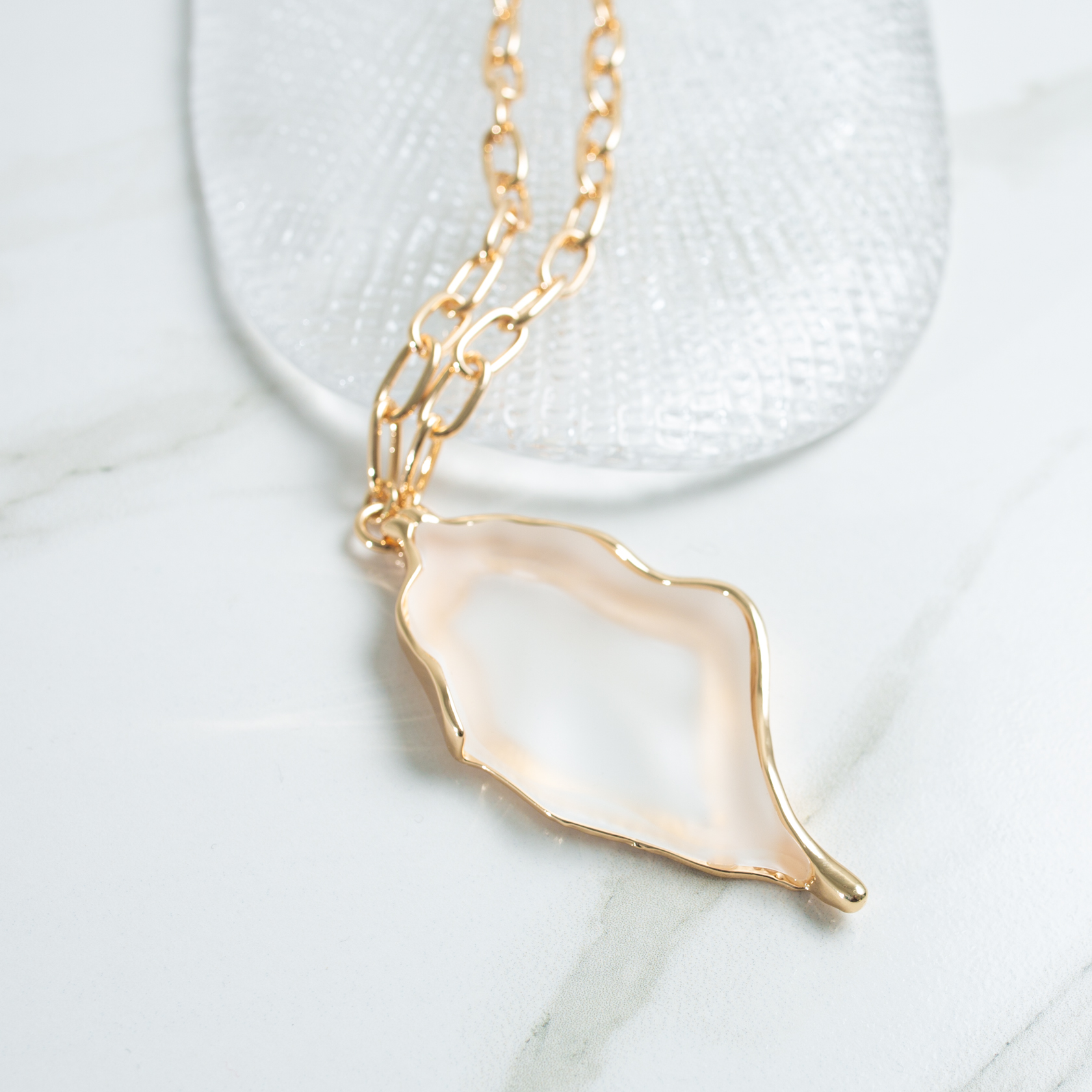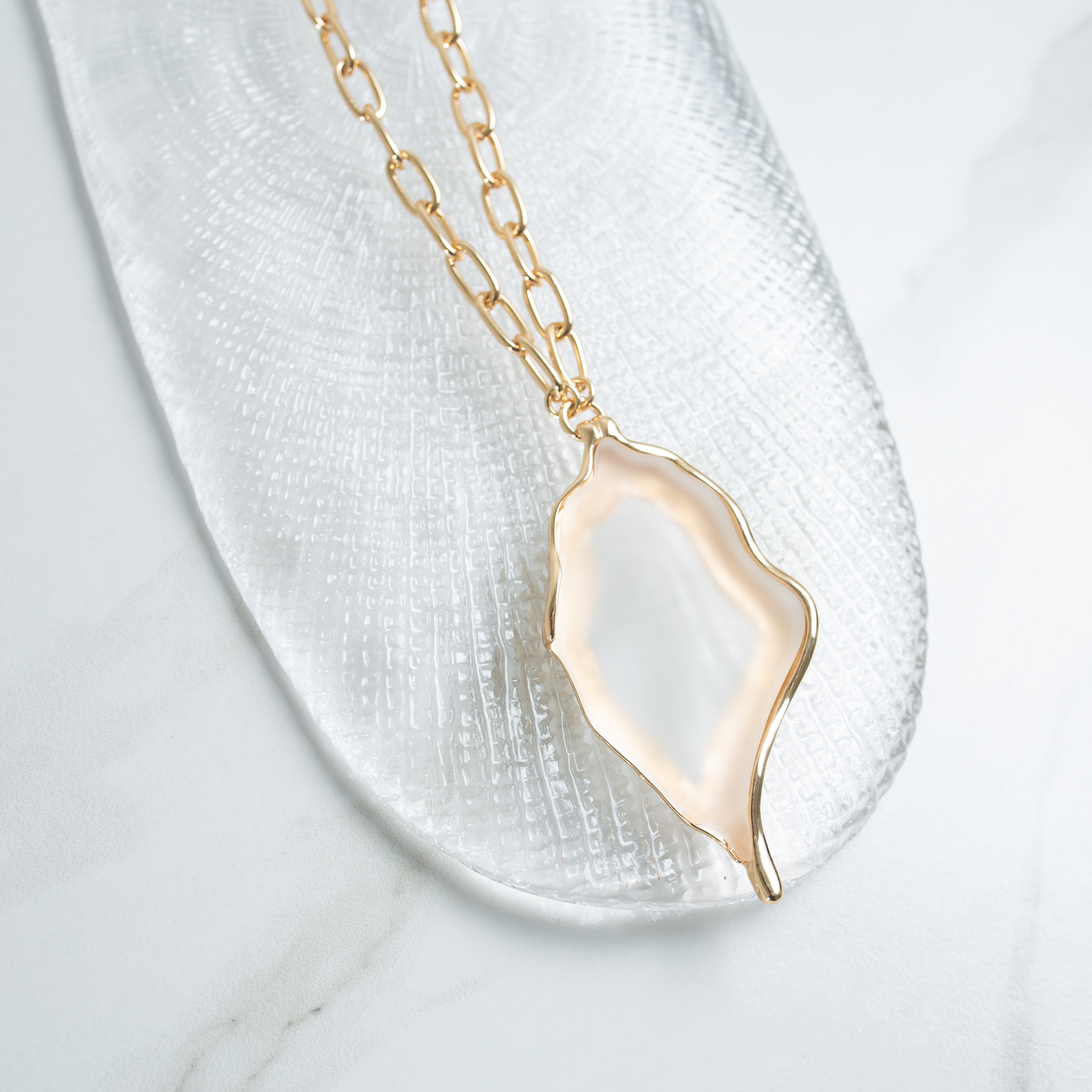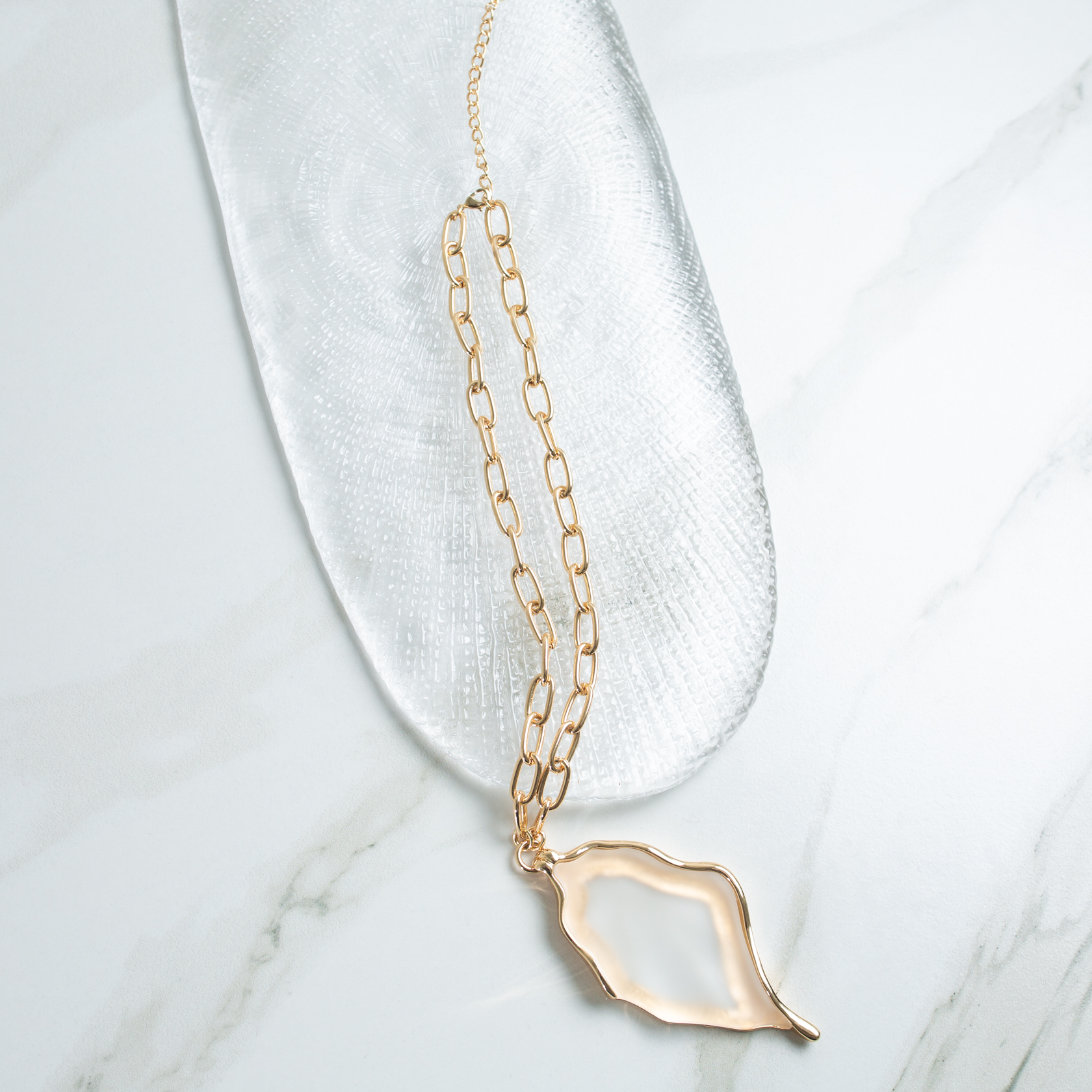 Колье-цепь с крупной подвеской плавной формы и матовой прозрачной вставкой.