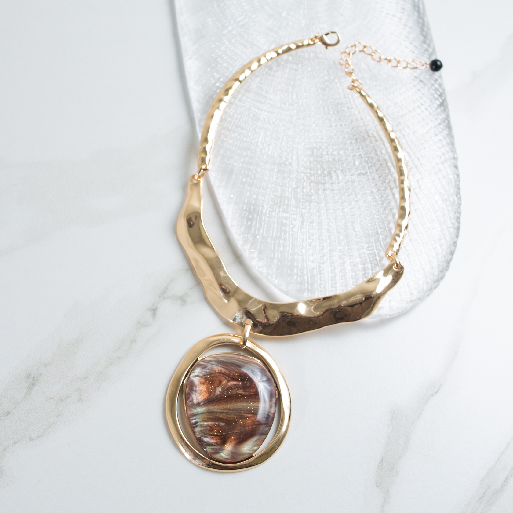 Колье Ambra G построено на сочетании жёстких металлических элементов и крупной подвески с декоративной вставкой. Эпоксидная смола создаёт эффект глубины и многослойности – внутри видны мягкие переливы оттенков, напоминающие натуральный камень или смолу, прогретую светом. За счёт гладкой поверхности подвеска смотрится цельно и собранно.