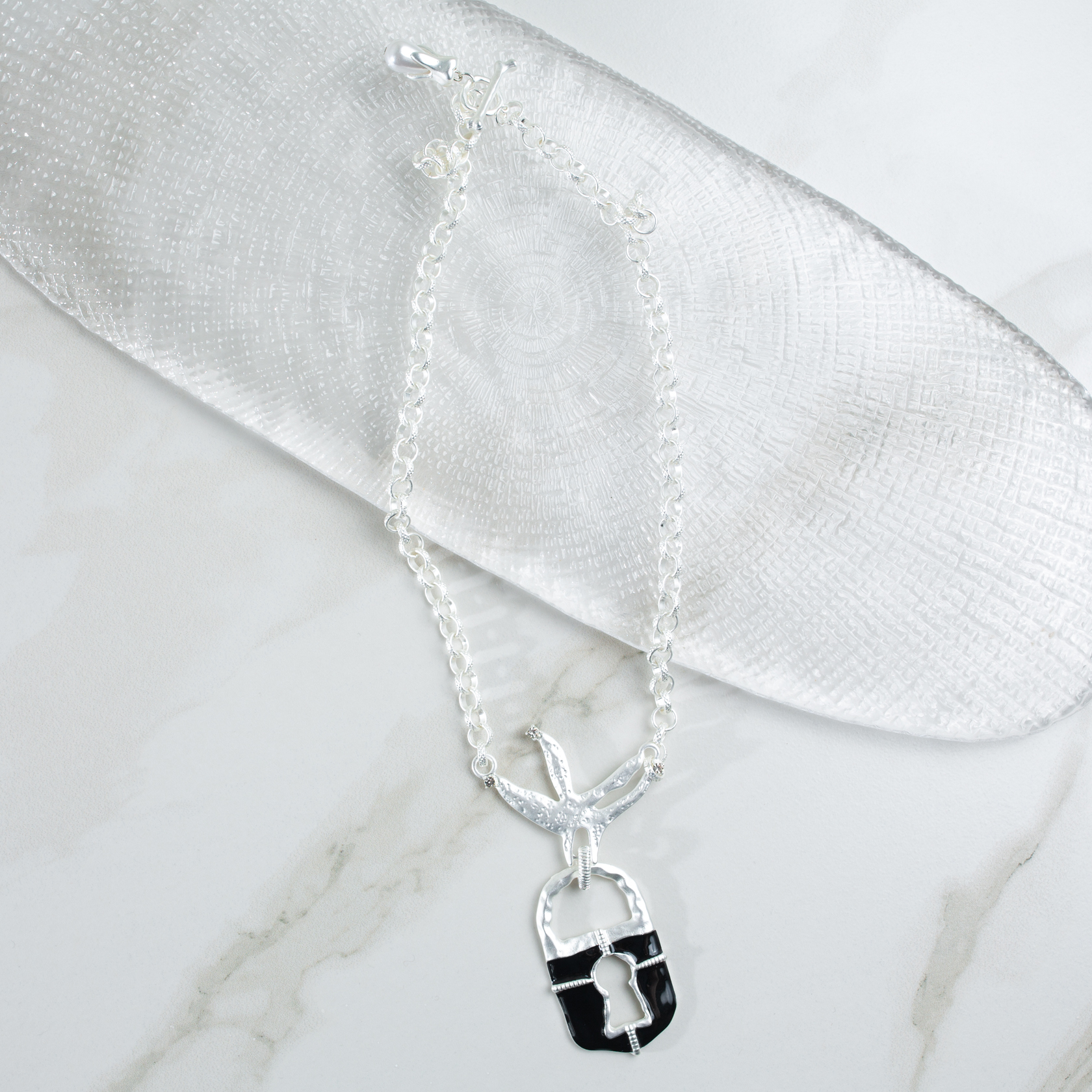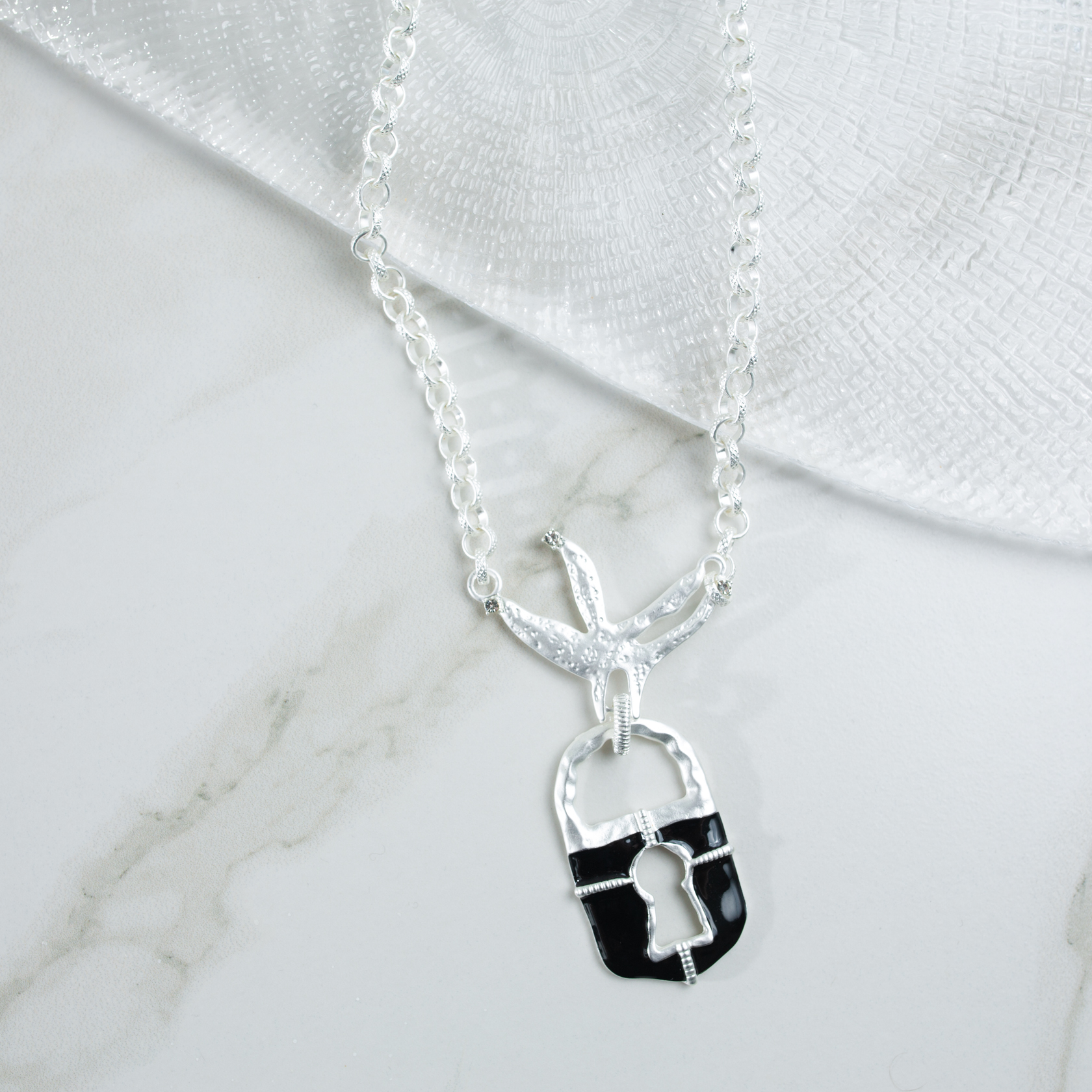 Колье Custode S выполнено на цепи среднего калибра и дополнено массивной подвеской-замком с чётким силуэтом. Серебристая поверхность подчёркнута эмалью глубокого чёрного оттенка, а небольшие кристаллы добавляют аккуратные световые акценты без излишнего блеска. Украшение воспринимается цельно и собранно, с выраженным центром композиции.