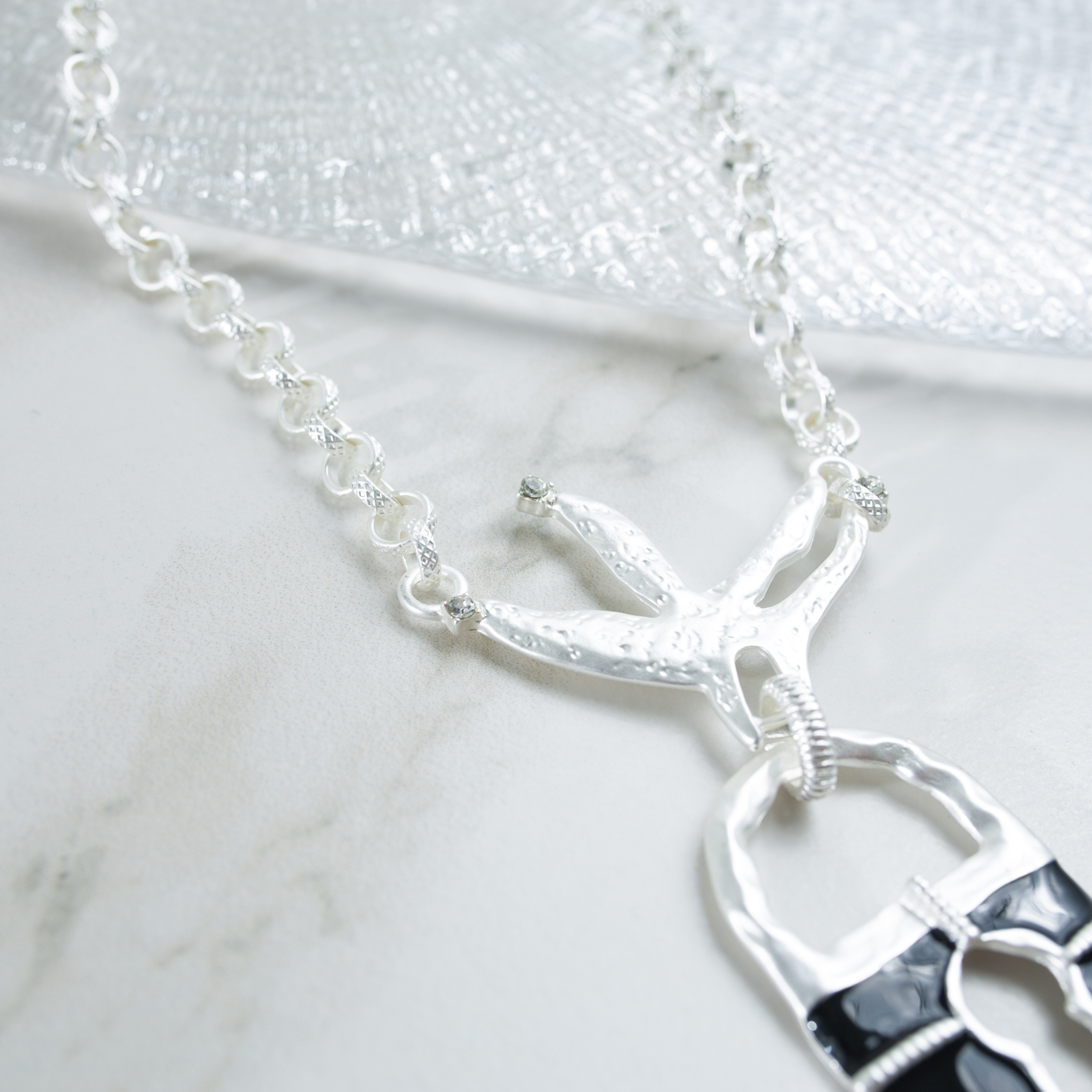 За счёт длины колье удобно ложится на зону декольте и работает как самостоятельный элемент образа. Хорошо сочетается с лаконичными платьями, жакетами и однотонными топами, добавляя графичность и структуру. Подходит для тех случаев, когда хочется визуального веса без перегруженности деталями.