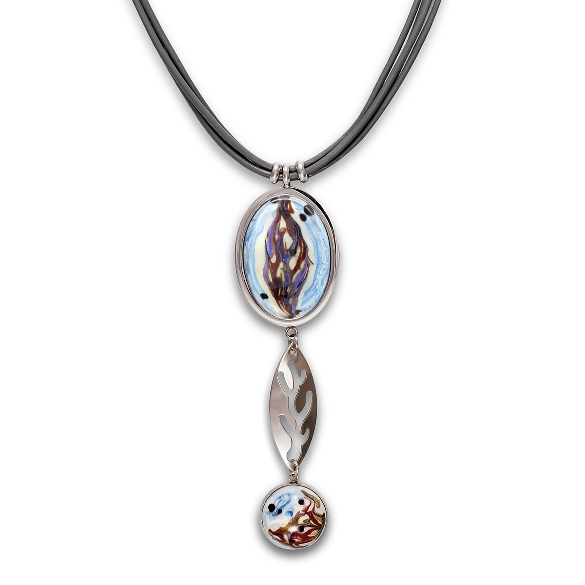 Колье изготовлено из натуральной кожи, муранского стекла и гипоаллергенной ювелирной стали, что очень важно для людей с чувствительной кожей. Металл не темнеет и не подвергается воздействиям окружающей среды, надолго обеспечивая красивый внешний вид изделия. Длина колье - 46 см + 5 см. удлиняющая цепочка. Длина кулона - 11 см. Размер стеклянного элемента - 4х3 см. и диаметр 2 см. Вес - 29 гр.