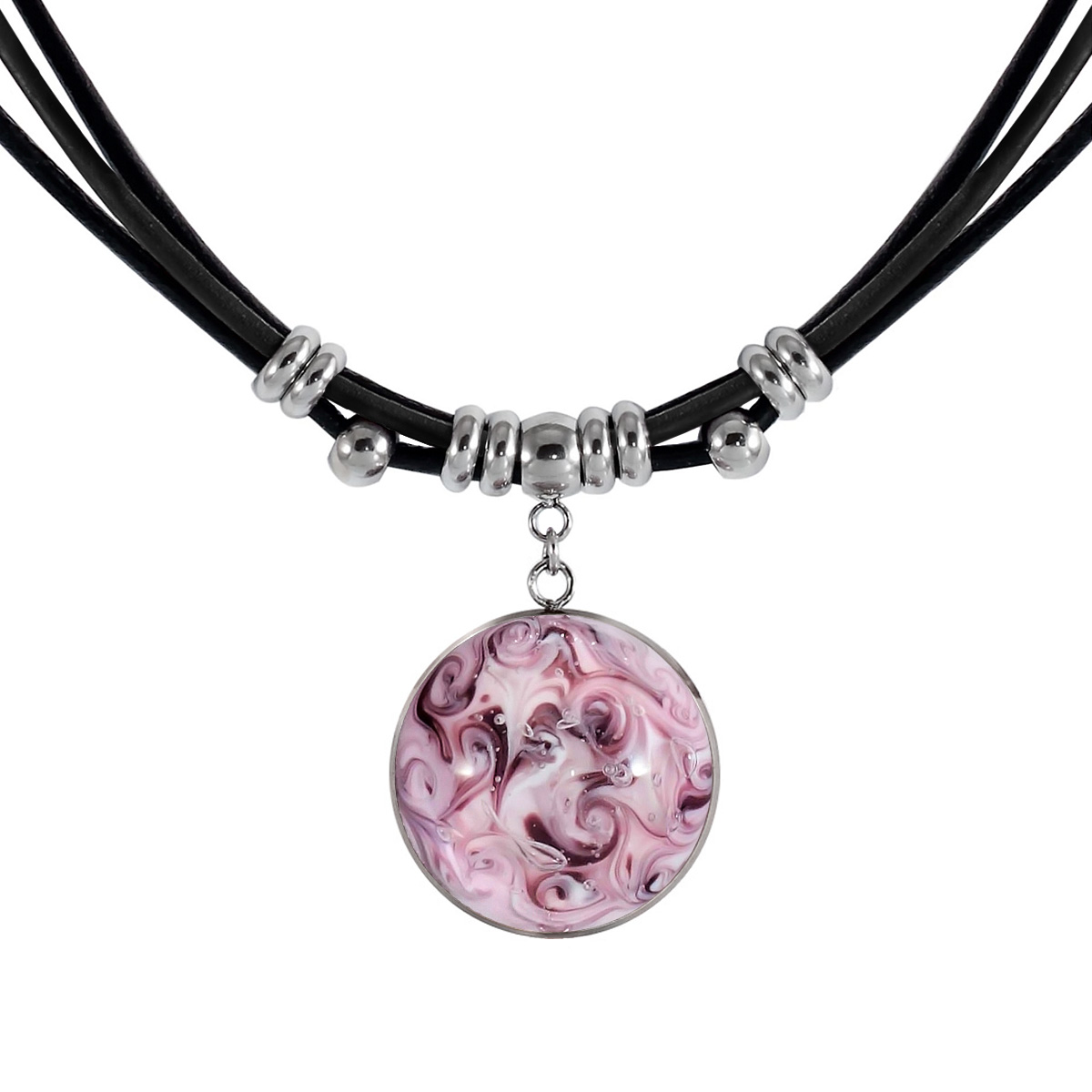 Колье изготовлено из натуральной кожи, муранского стекла и гипоаллергенной ювелирной стали, что очень важно для людей с чувствительной кожей. Металл не темнеет и не подвергается воздействиям окружающей среды, надолго обеспечивая красивый внешний вид изделия. Длина колье - 46 см + 5 см. удлиняющая цепочка. Длина кулона - 7 см. Диаметр стеклянного элемента - 2,5 см. Вес - 17 гр.
