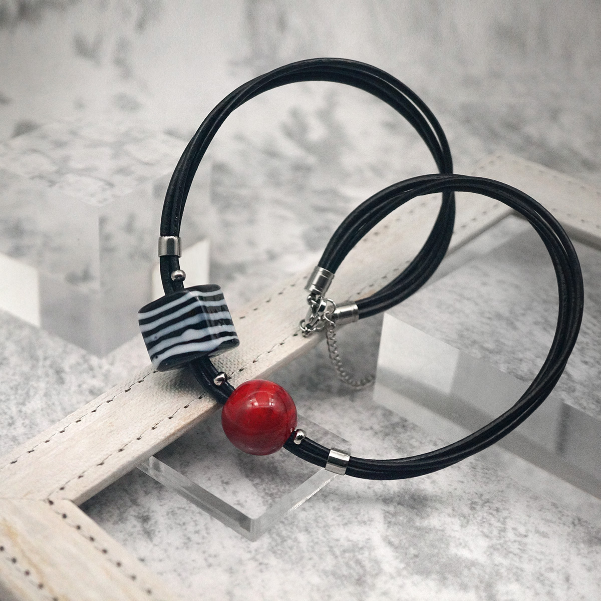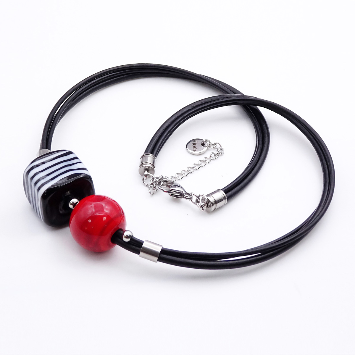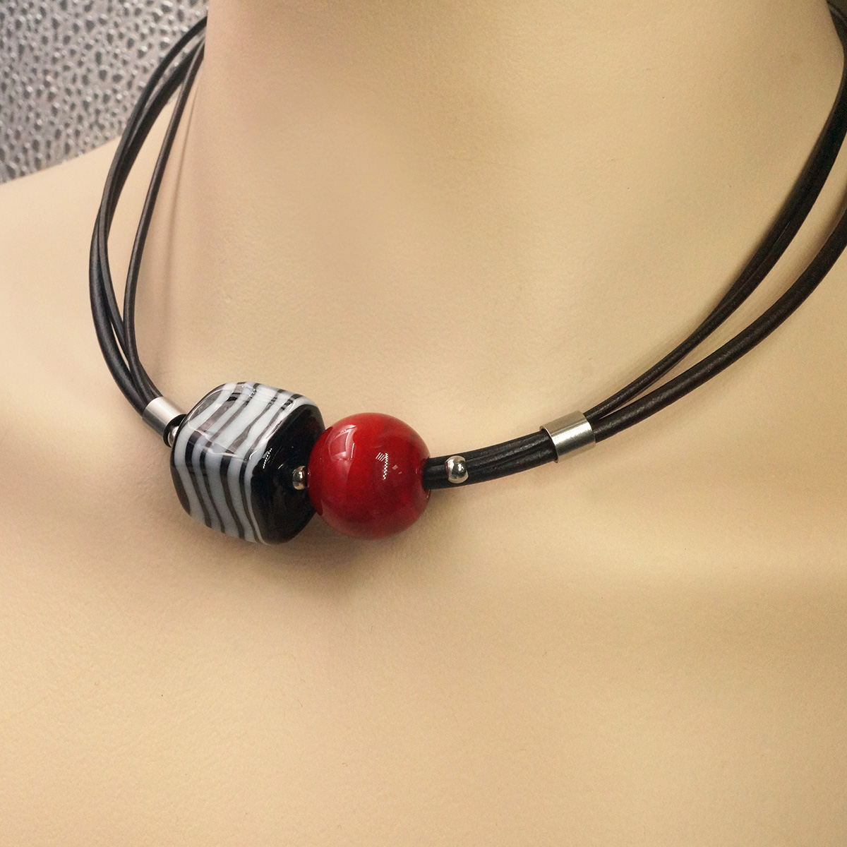 Колье изготовлено из натуральной кожи, муранского стекла и гипоаллергенной ювелирной стали, что очень важно для людей с чувствительной кожей. Металл не темнеет и не подвергается воздействиям окружающей среды, надолго обеспечивая красивый внешний вид изделия. Длина колье - 46 см + 5 см. удлиняющая цепочка. Диаметр стеклянного шара - 1,8 см. Размер куба - 1,8х1,8 см. Вес - 32 гр.
