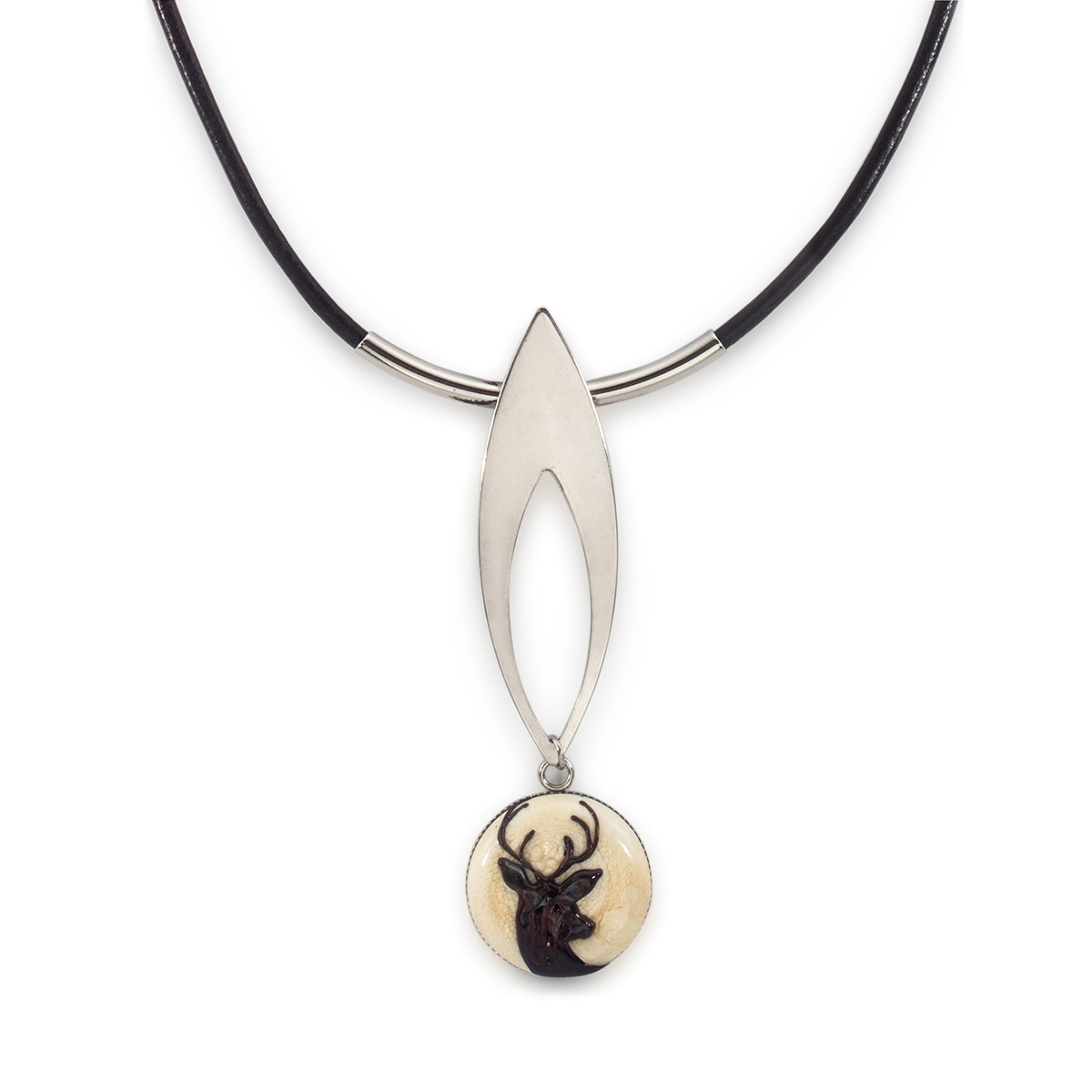 Колье изготовлено из натуральной кожи, муранского стекла и гипоаллергенной ювелирной стали, что очень важно для людей с чувствительной кожей. Металл не темнеет и не подвергается воздействиям окружающей среды, надолго обеспечивая красивый внешний вид изделия. Длина колье - 46 см + 5 см. удлиняющая цепочка. Длина кулона - 8 см. Диаметр стеклянного элемента - 2,5 см. Вес - 16 гр.
