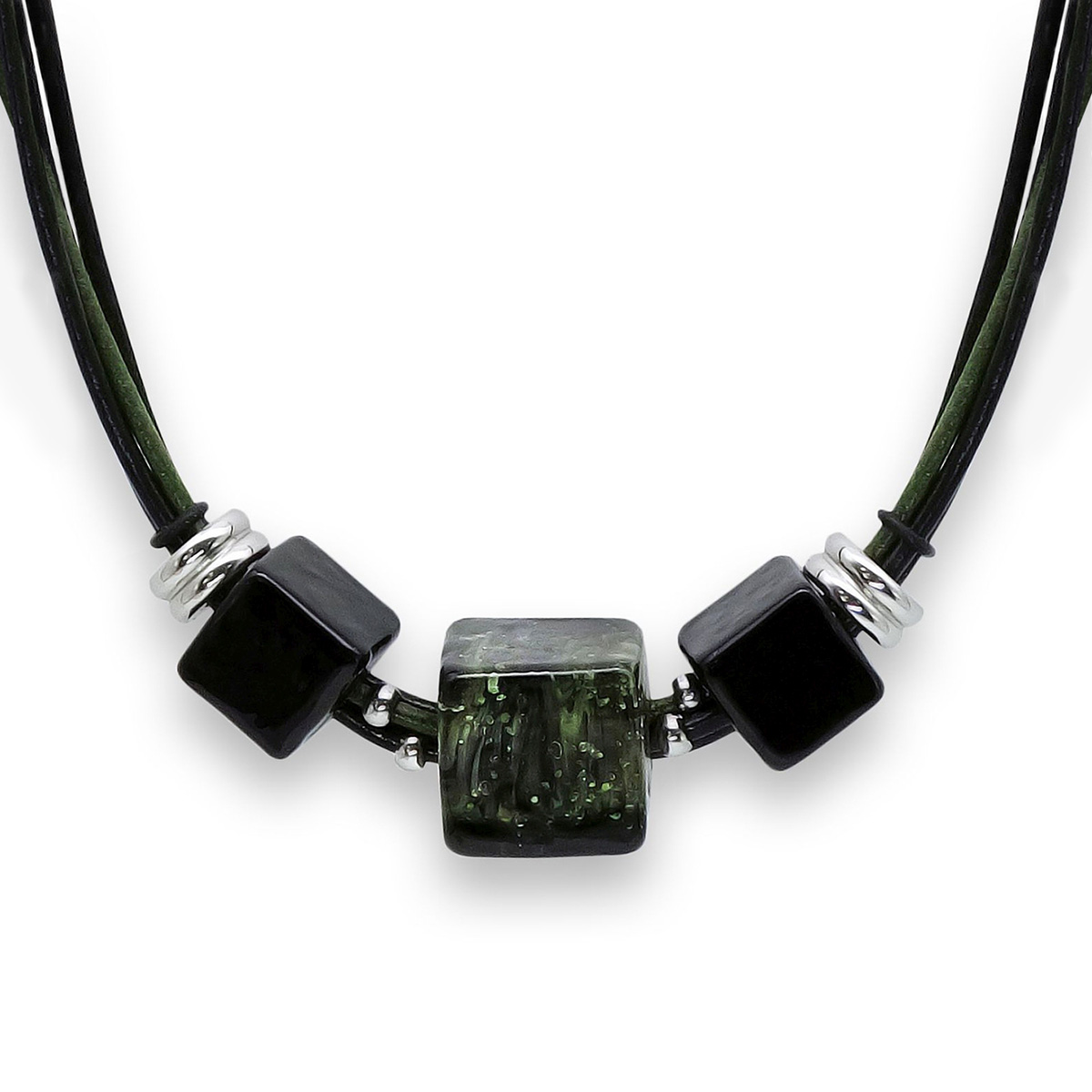 Колье изготовлено из натуральной кожи, муранского стекла и гипоаллергенной ювелирной стали, что очень важно для людей с чувствительной кожей. Металл не темнеет и не подвергается воздействиям окружающей среды, надолго обеспечивая красивый внешний вид изделия. Длина колье - 46 см + 5 см. удлиняющая цепочка. Размер стеклянных бусин - 1,8х1,8 и 1,2х1,2 см. Вес - 39 гр.