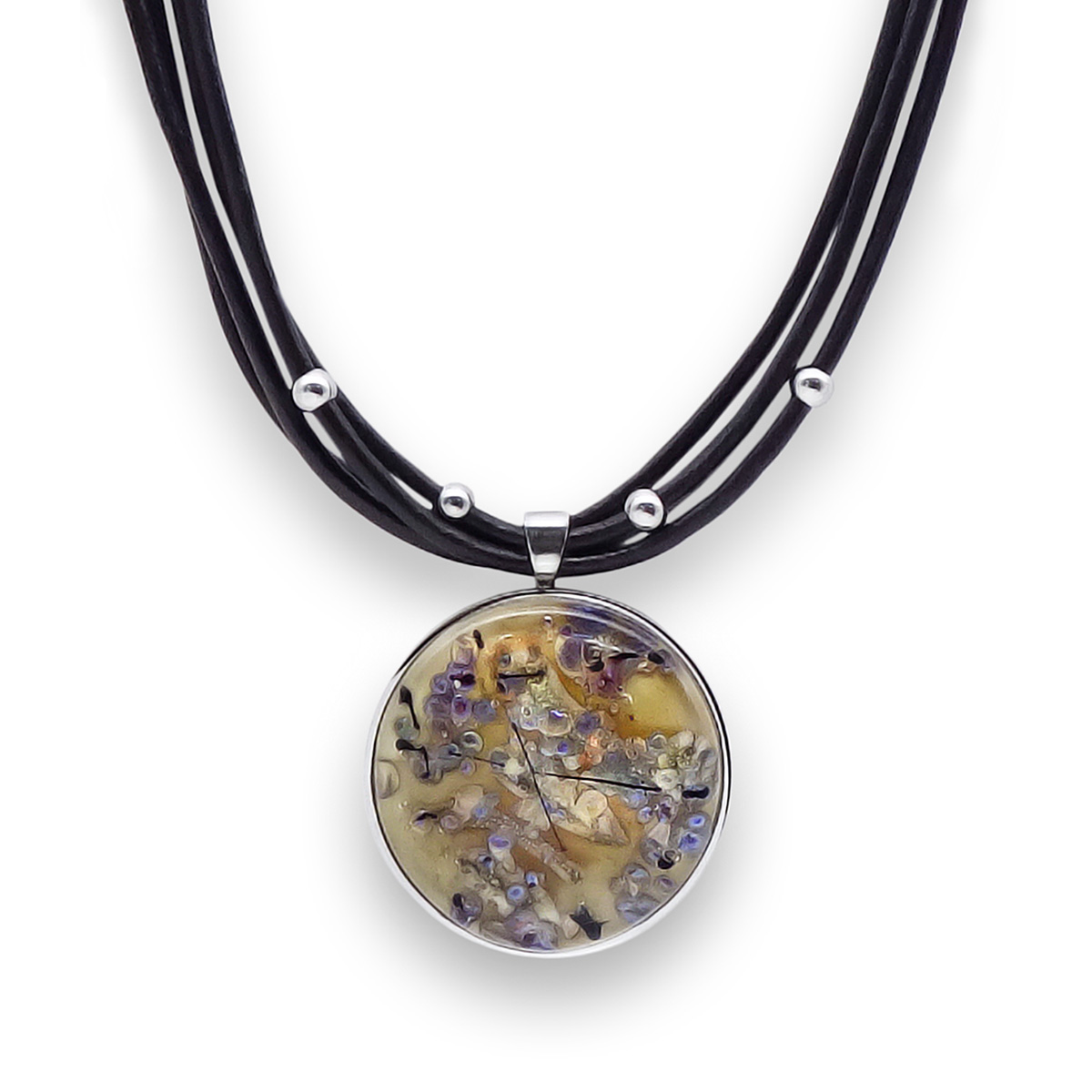 Колье изготовлено из натуральной кожи, муранского стекла и гипоаллергенной ювелирной стали, что очень важно для людей с чувствительной кожей. Металл не темнеет и не подвергается воздействиям окружающей среды, надолго обеспечивая красивый внешний вид изделия. Длина колье - 46 см + 5 см. удлиняющая цепочка. Диаметр стеклянного элемента - 3 см. Вес - 25 гр.
