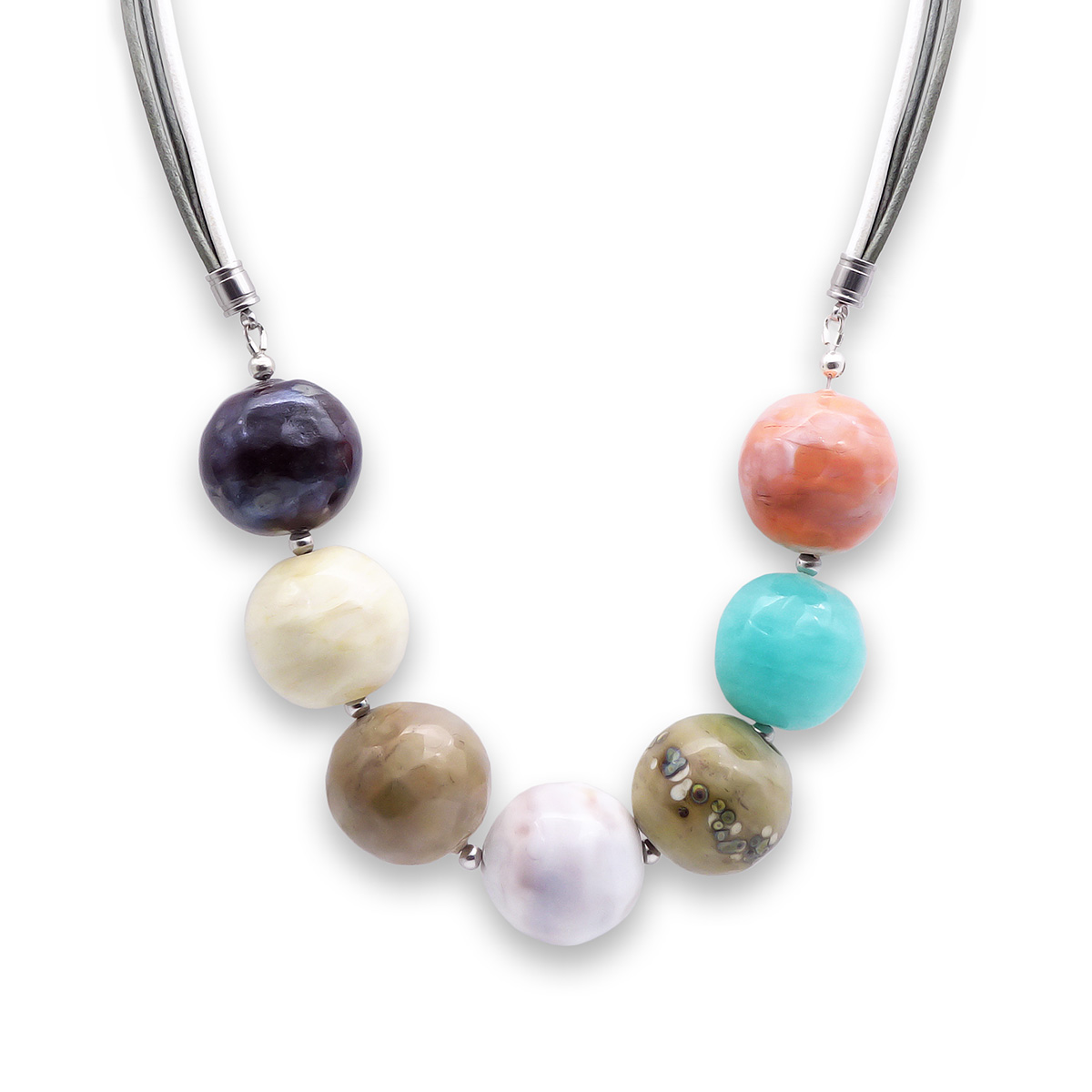 Колье изготовлено из натуральной кожи, муранского стекла и гипоаллергенной ювелирной стали, что очень важно для людей с чувствительной кожей. Металл не темнеет и не подвергается воздействиям окружающей среды, надолго обеспечивая красивый внешний вид изделия. Длина колье - 46 см + 5 см. удлиняющая цепочка. Диаметр стеклянных шаров - 2.2 и 2,3 см. Вес - 88 гр.