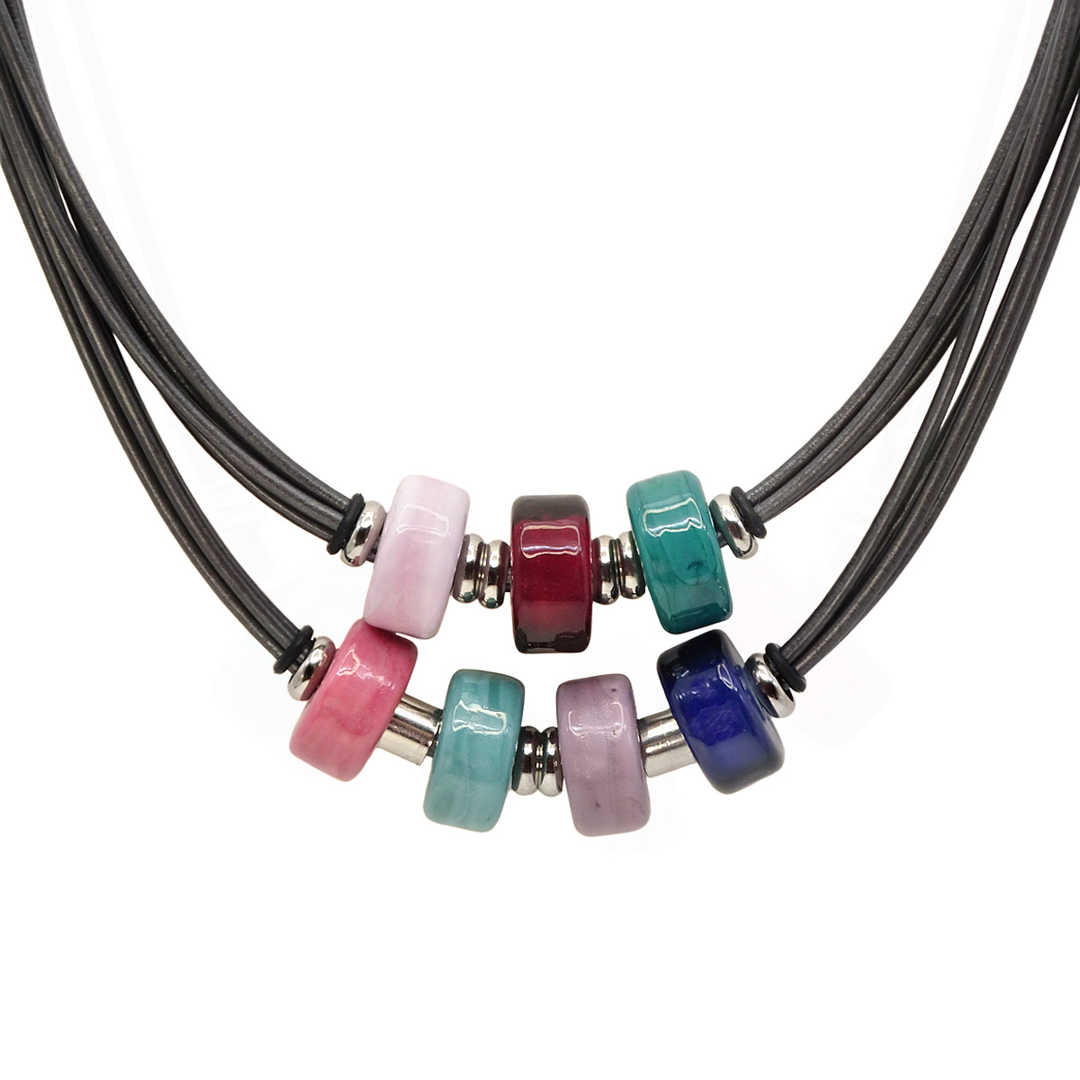Колье изготовлено из натуральной кожи, муранского стекла и гипоаллергенной ювелирной стали, что очень важно для людей с чувствительной кожей. Металл не темнеет и не подвергается воздействиям окружающей среды, надолго обеспечивая красивый внешний вид изделия. Длина колье - 43 см + 5 см. удлиняющая цепочка. Размер стеклянных ронделей - 0,7*1,5 см. Вес - 23 гр.