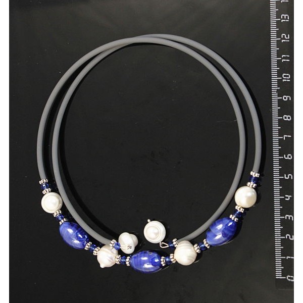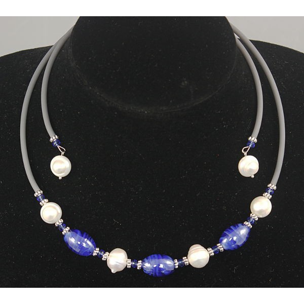 Колье на струнке из жемчуга белого и синего муранского стекла