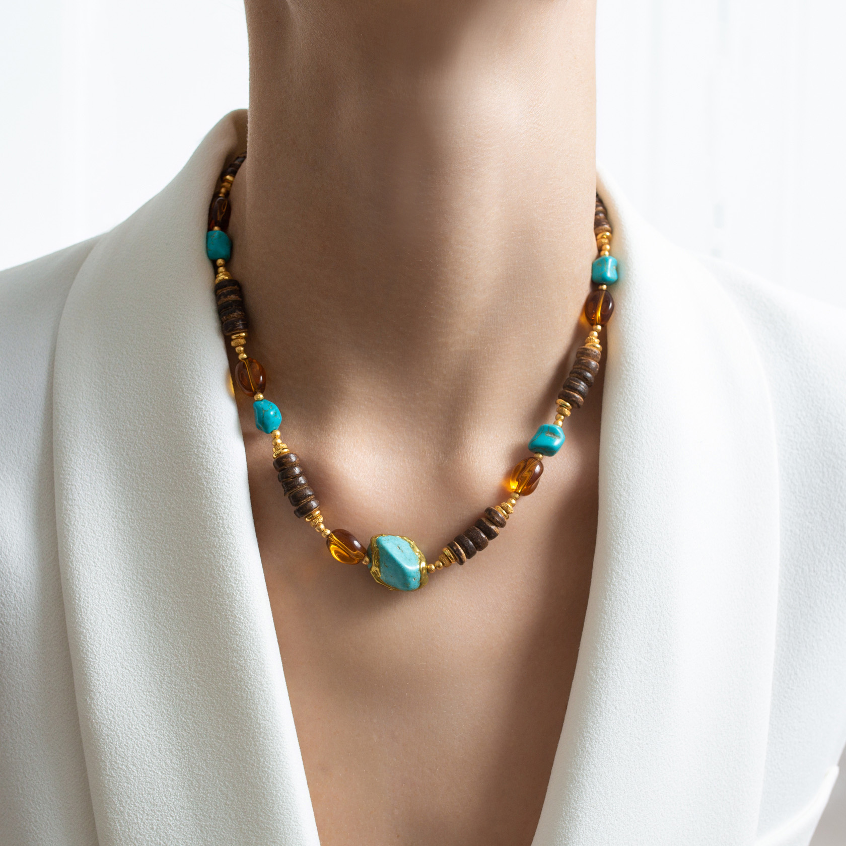 Колье Nativa G собрано на основе натуральной бирюзы с дополнением бусин из стекла с эффектом янтаря. Композиция выглядит живой и собранной, без этники и перегруза, с акцентом на природные фактуры и цвет.