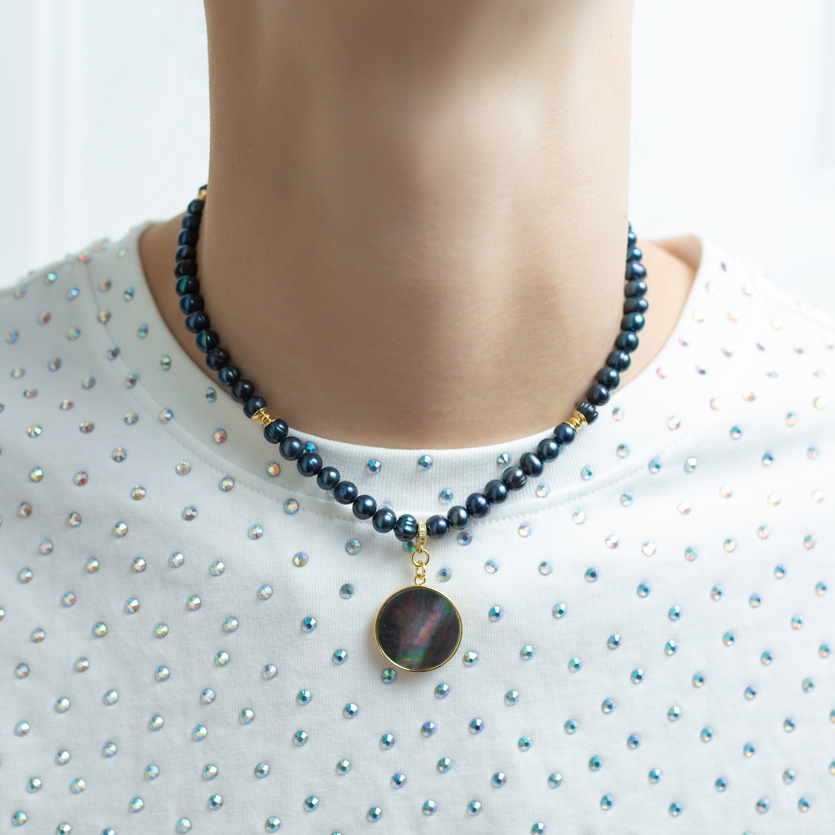 Ювелирный сплав, золочение, натуральный тёмный перламутр, речной чёрный жемчуг, кристаллы.