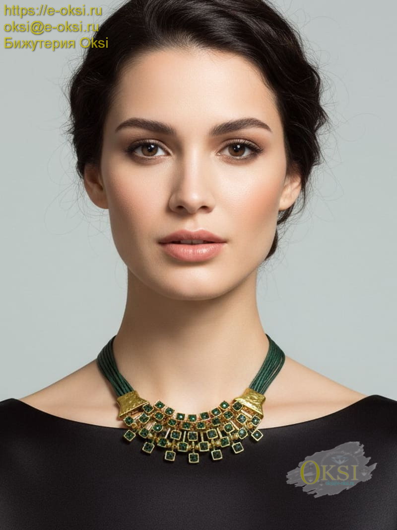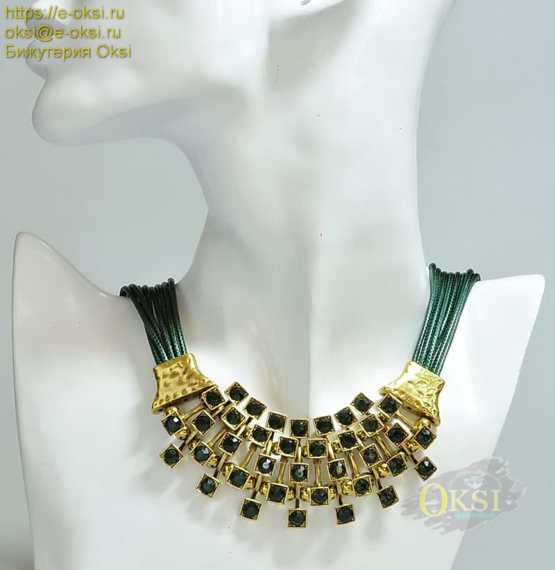 Стильное, очень красивое колье изумрудного - зеленого оттенка. Зеленого много не бывает. Особенно, если его оттенки удачно подобраны и идеально сочетаются. Акцентировать внимание на зеленом можно с помощью нейтрального фона. Лучший контраст создает белый и черный. Очень красивые и яркие сочетания с оранжевым и желтым, а также серебряным и золотым цветом одежды и аксессуаров. Качественное гальваническое покрытие золотого цвета. Длина колье 45 см, ширина 5 см.