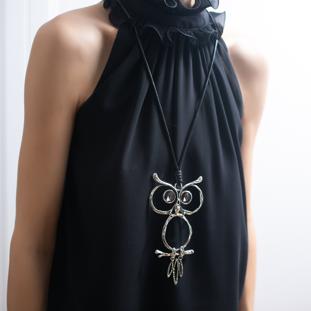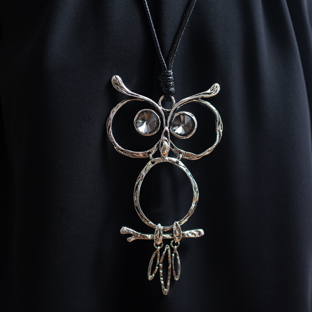 Подвеска изготовлена из металла, что гарантирует его прочность и долговечность. Родиевое покрытие придает украшению блеск и защищает его от царапин. Подвеска в виде совы с глазами, выполненными из кристаллов, добавляет оригинальности и шарма.