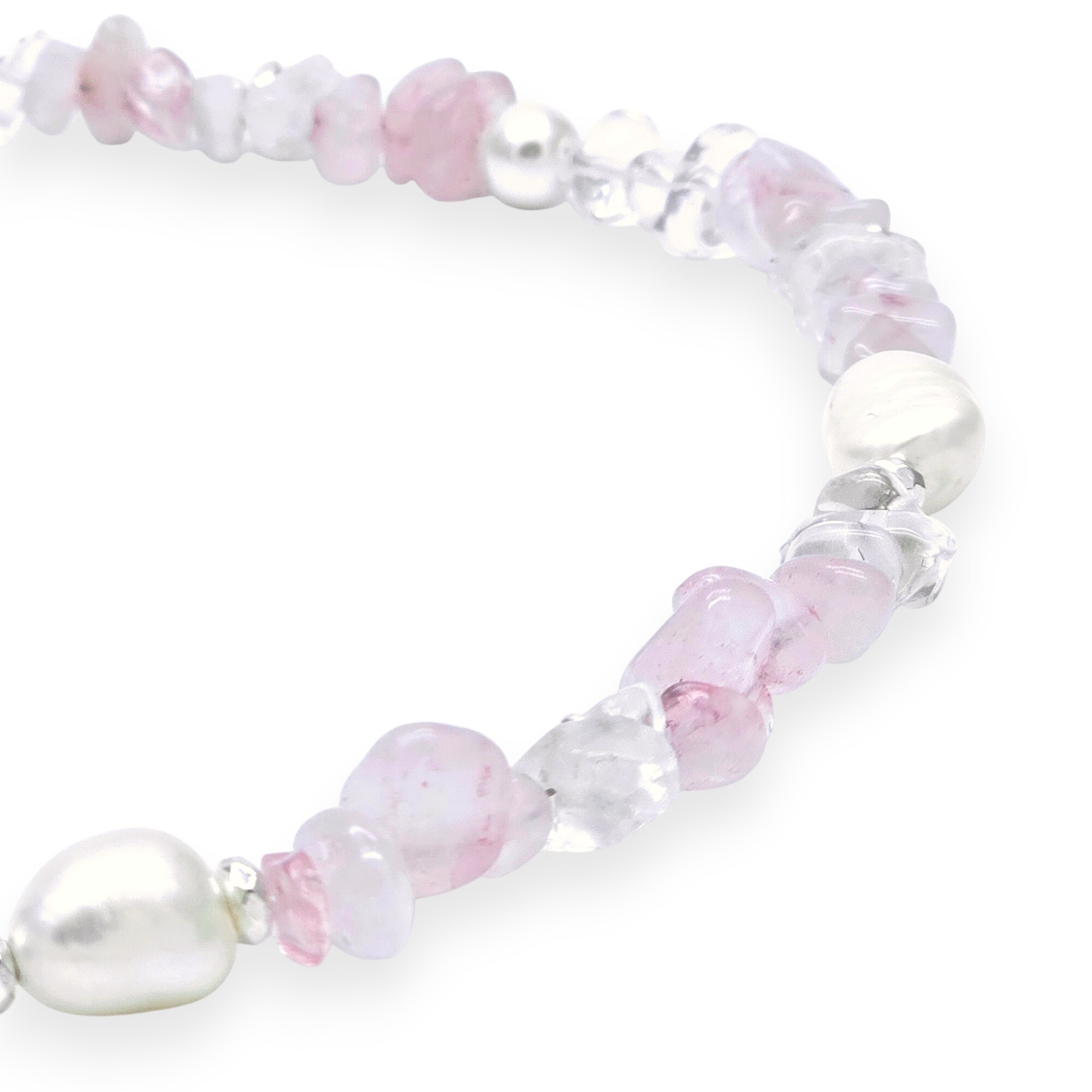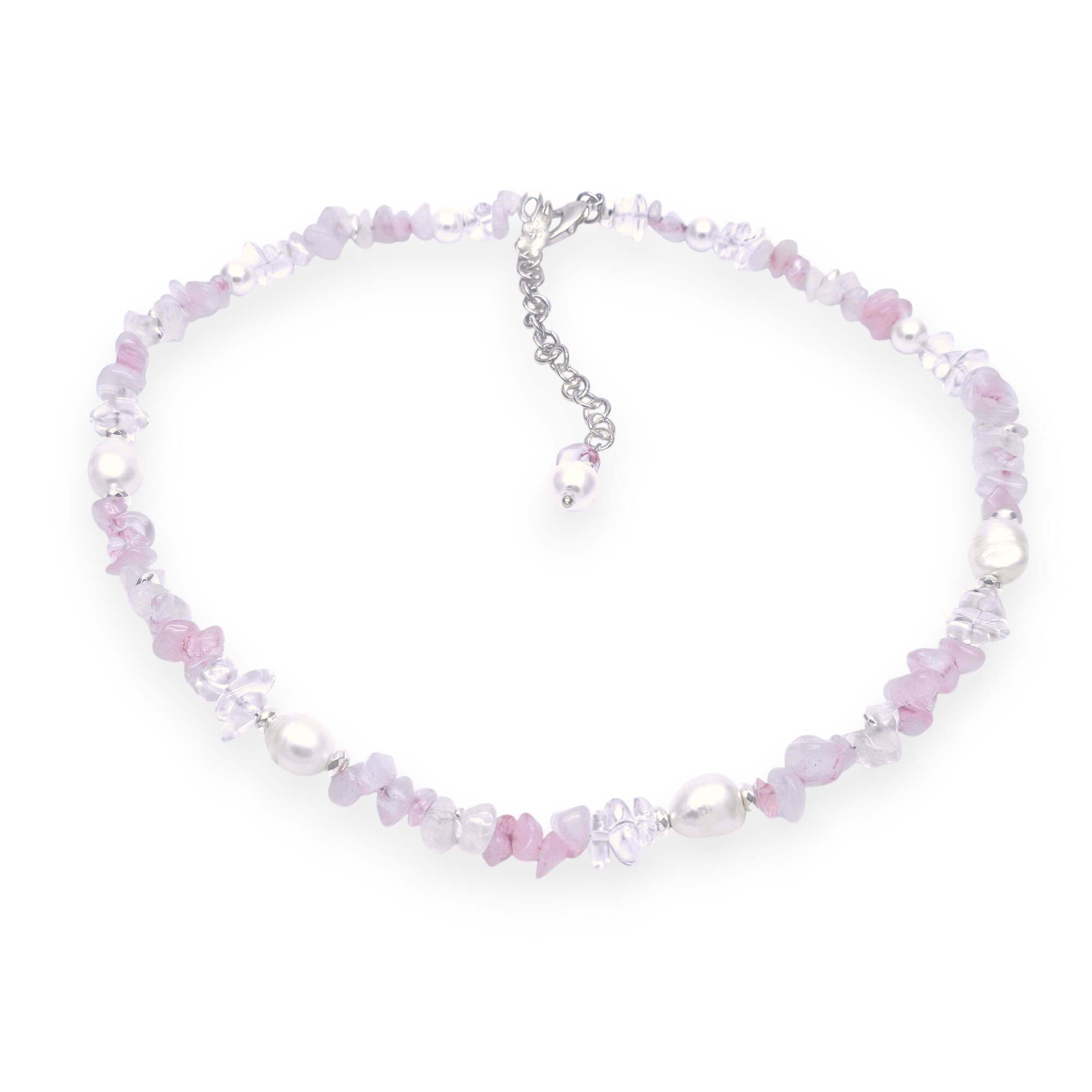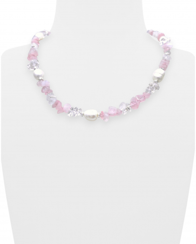 Розовый кварц, хрусталь, натуральный жемчуг, жемчуг Майорка, ювелирный сплав. Гальваническое покрытие: родий.
