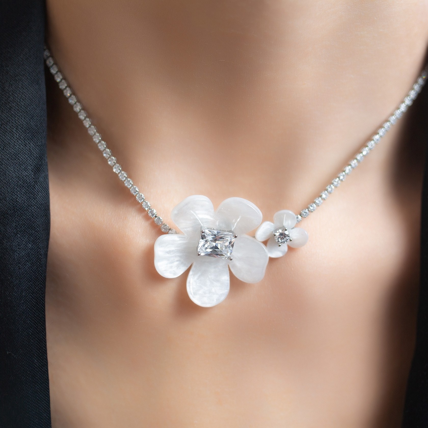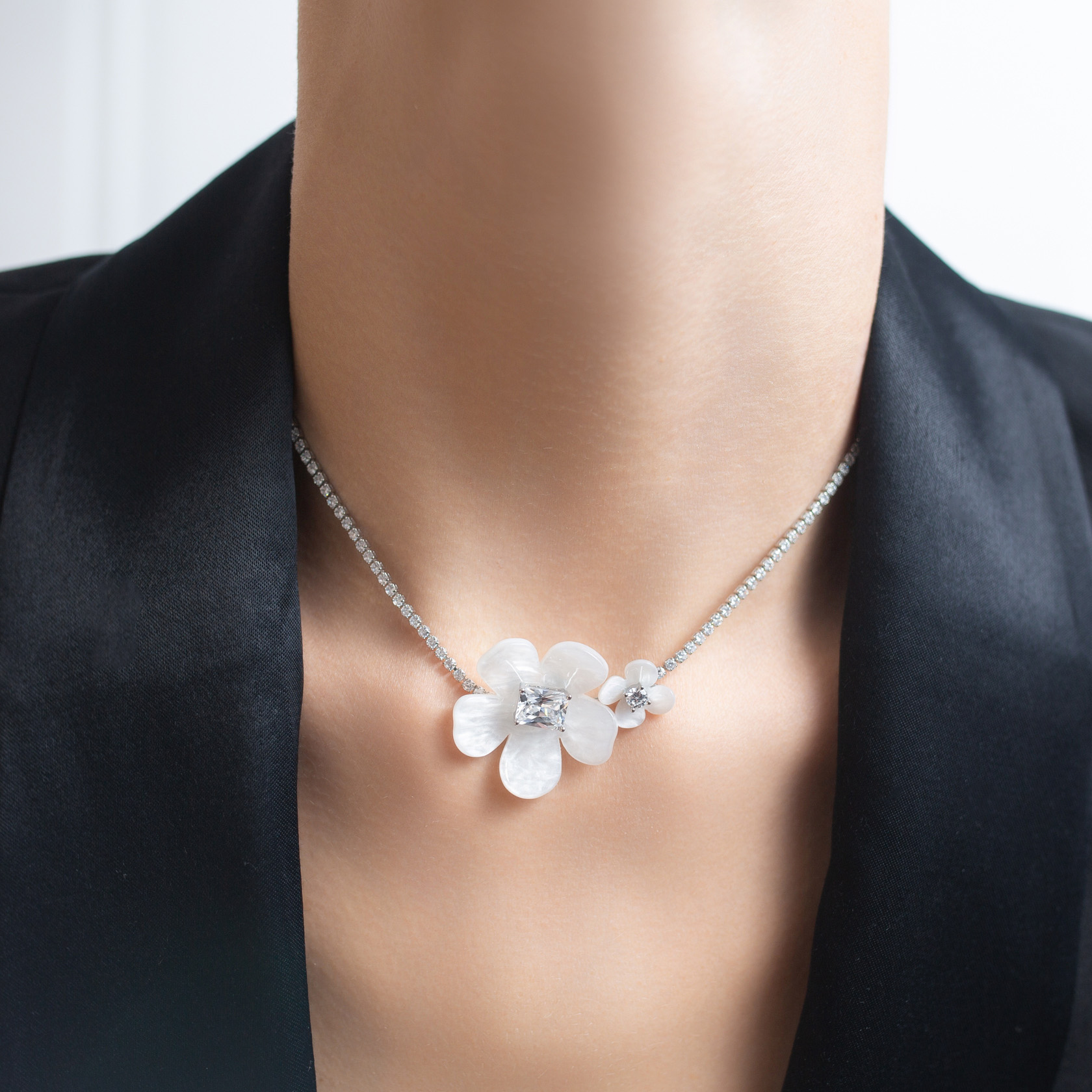 Ювелирный сплав, родиевое покрытие, натуральный перламутр, кристаллы.