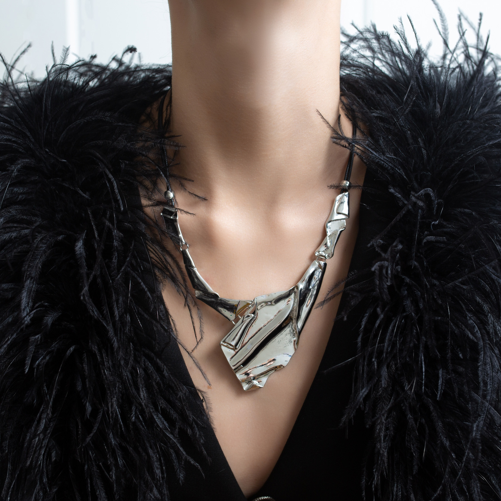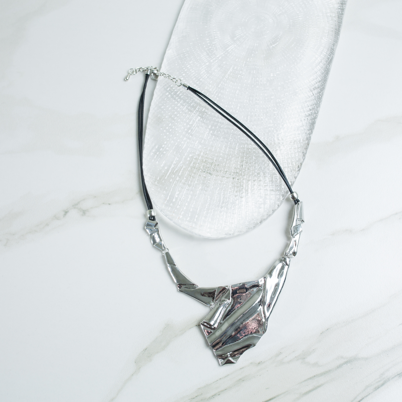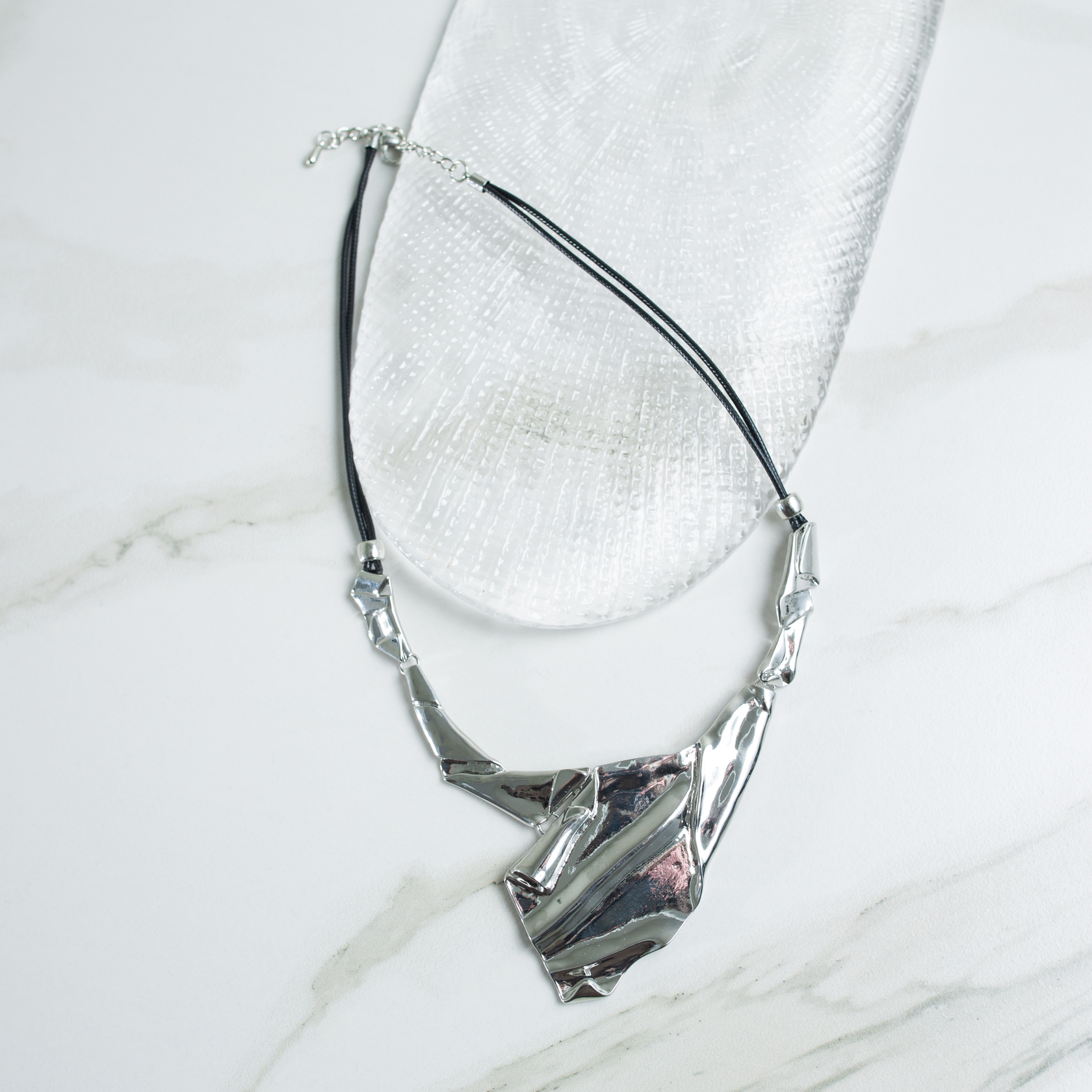 Колье Scaglia S выполнено на кожаном шнурке и дополнено массивной подвеской с намеренно неровной, «смятой» поверхностью. Форма работает как центральный визуальный акцент и сразу задаёт характер всему образу.