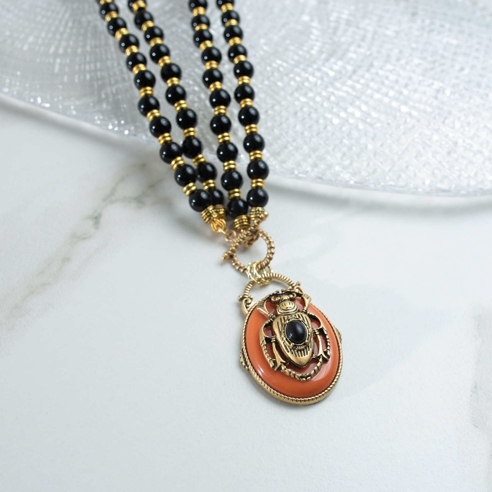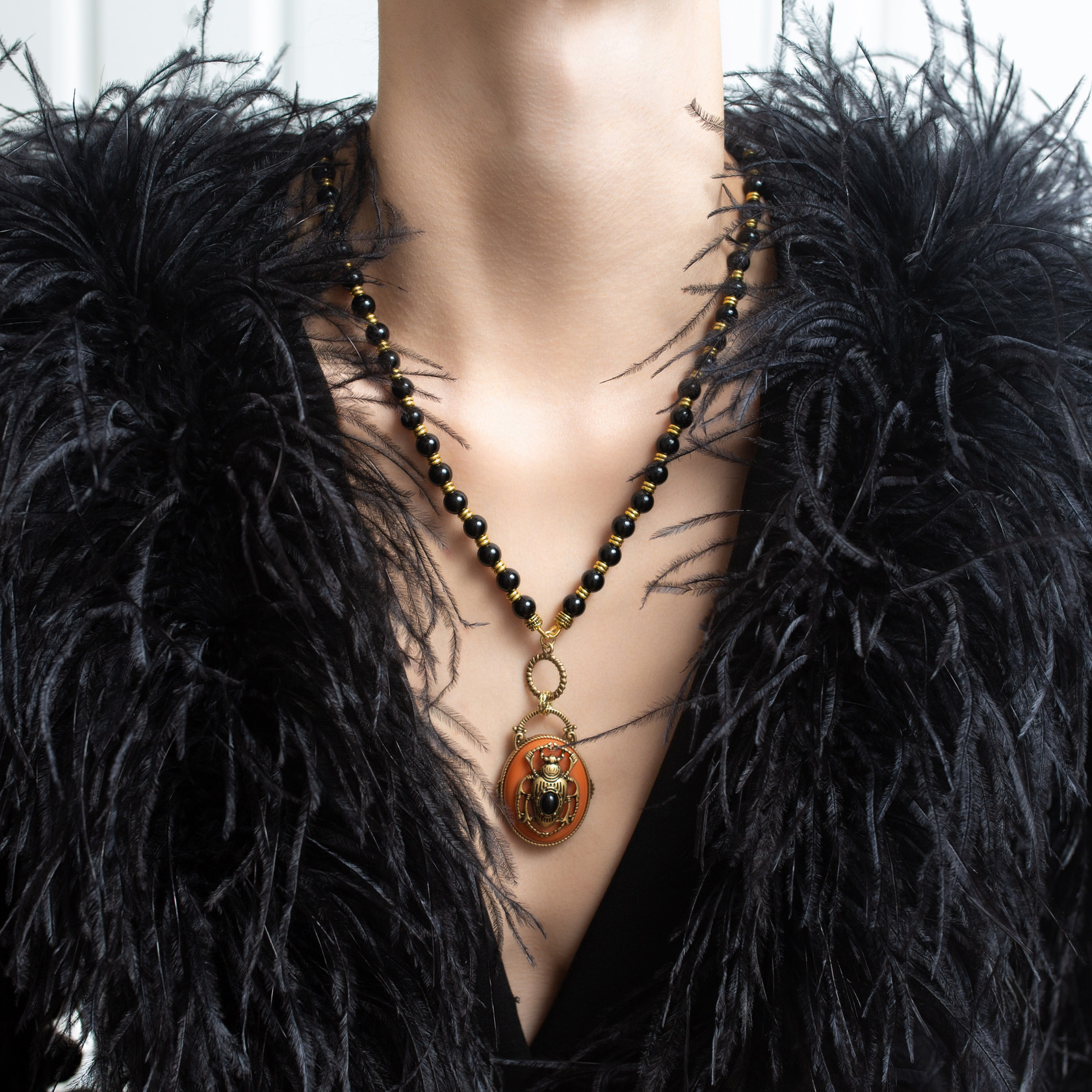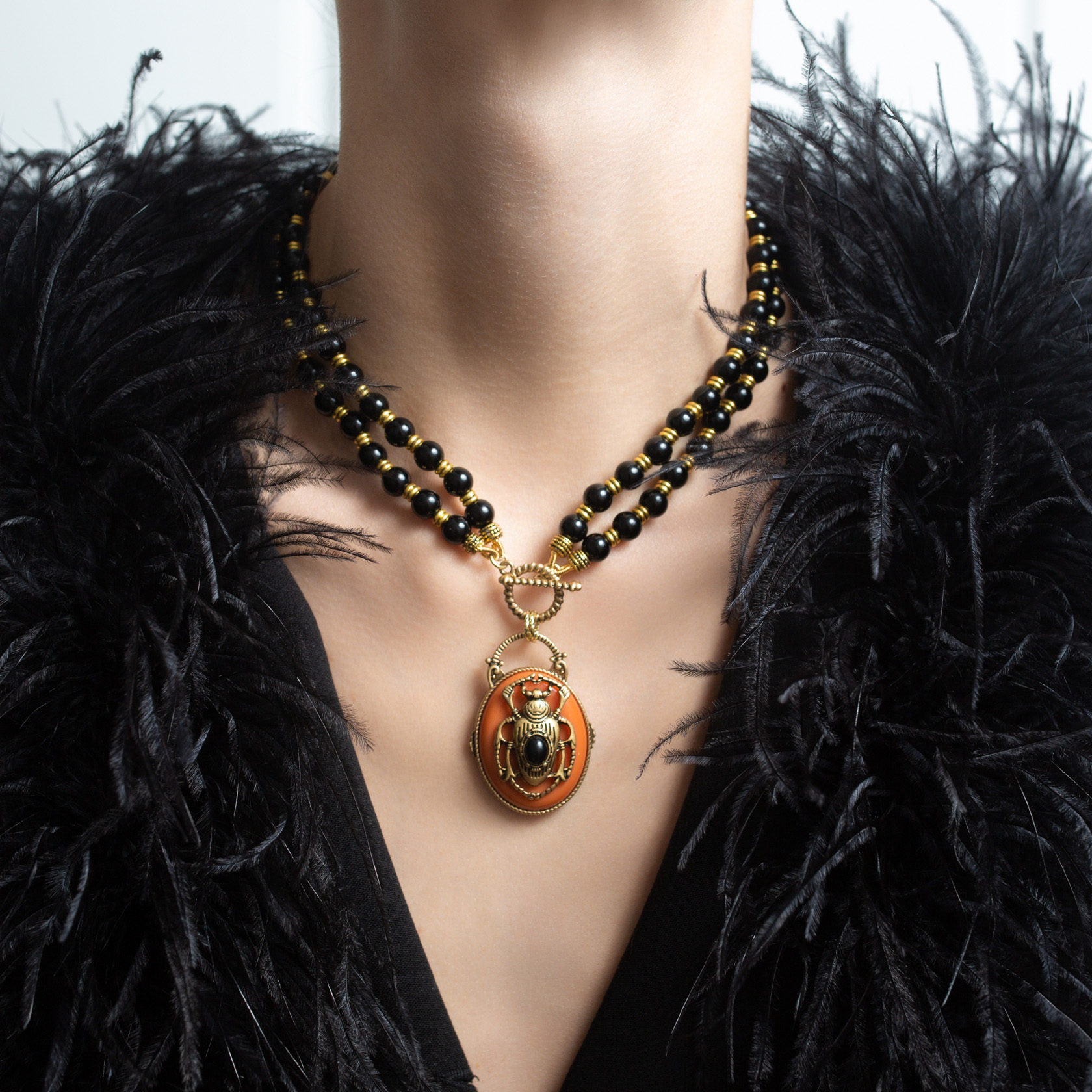 Акцентное колье с декоративным подвесом в виде жука в тёплом коричневом оттенке. Многослойная композиция из чёрных бусин и золотистых элементов создаёт плотный, собранный образ с более мягким, «теплым» характером по сравнению с чёрной версией.