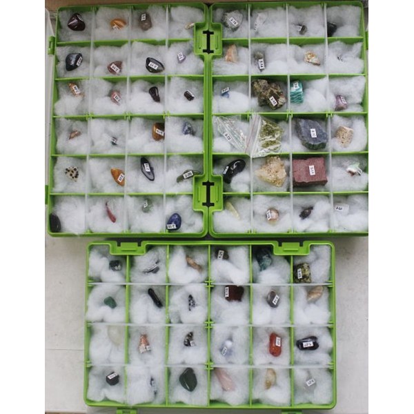 Коллекция минералов и горных пород, 72 образца в 3 коробках 26х18см, ячейка 4см