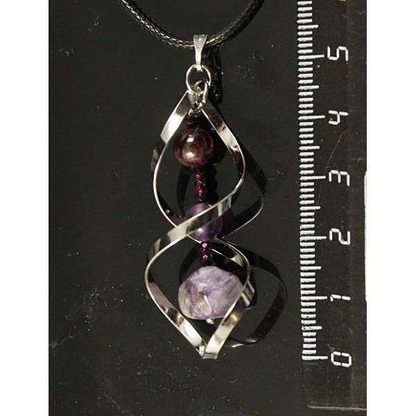 Кулон в спирали чароит (галтовка крупная), аметист и гранат (шарик 6мм), гематит (шарик 2мм огранка)