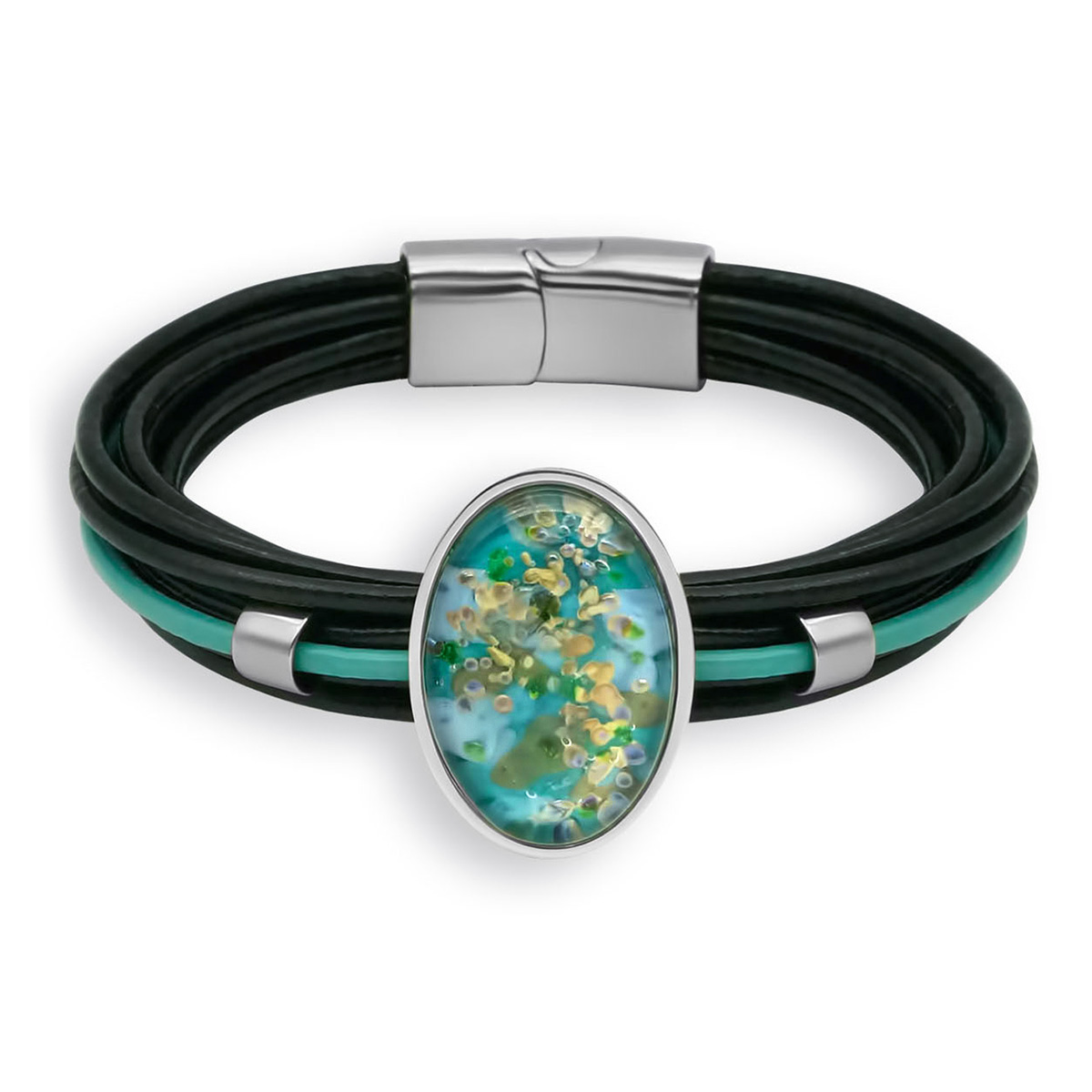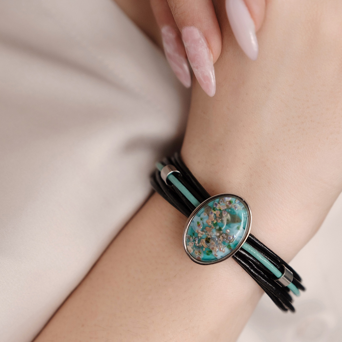 Браслет изготовлен из муранского стекла, натуральной кожи и гипоаллергенной ювелирной стали, что очень важно для людей с чувствительной кожей. Металл не темнеет и не подвергается воздействиям окружающей среды, надолго обеспечивая красивый внешний вид изделия. Крепкий магнитный замок с двойной защитой надежно фиксируется на запястье. Ширина браслета - 1,5 см. Размер стеклянного элемента - 1,9*2,6 см. Вес - 22 гр.