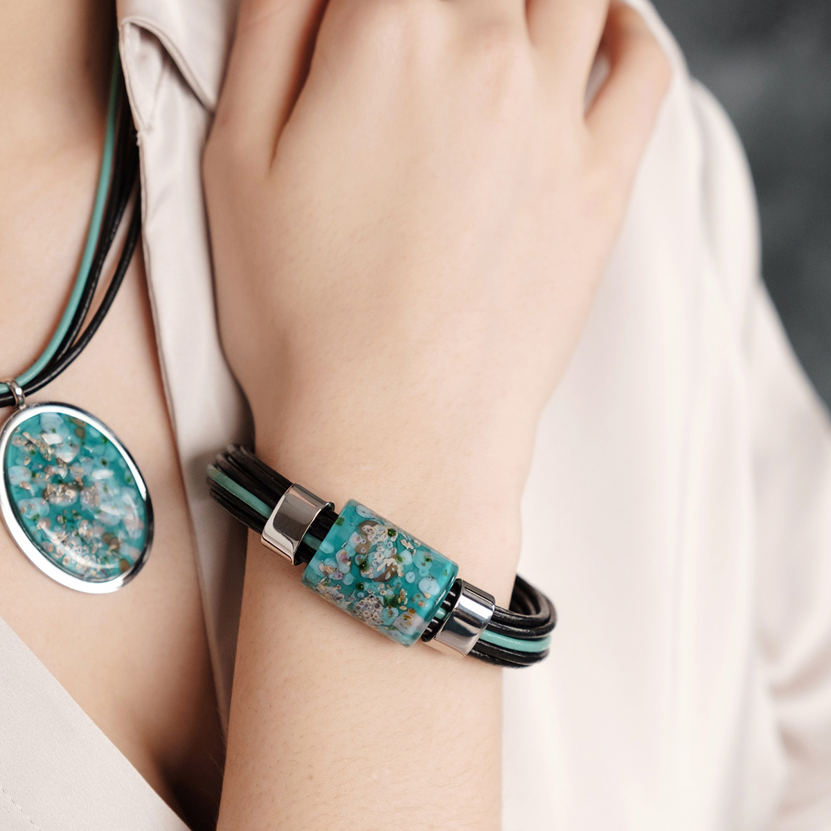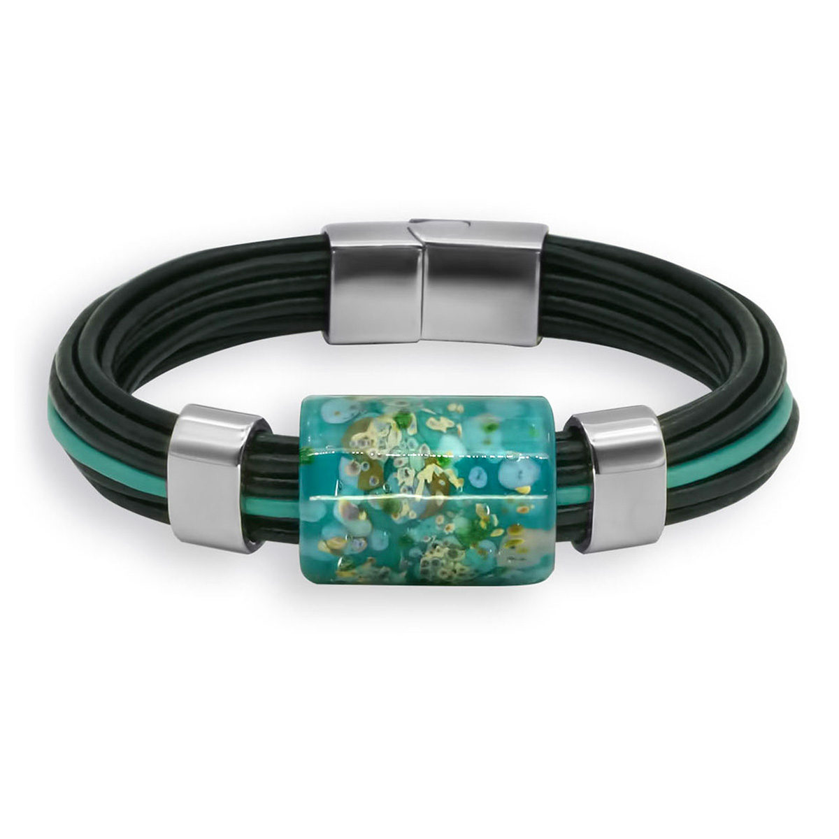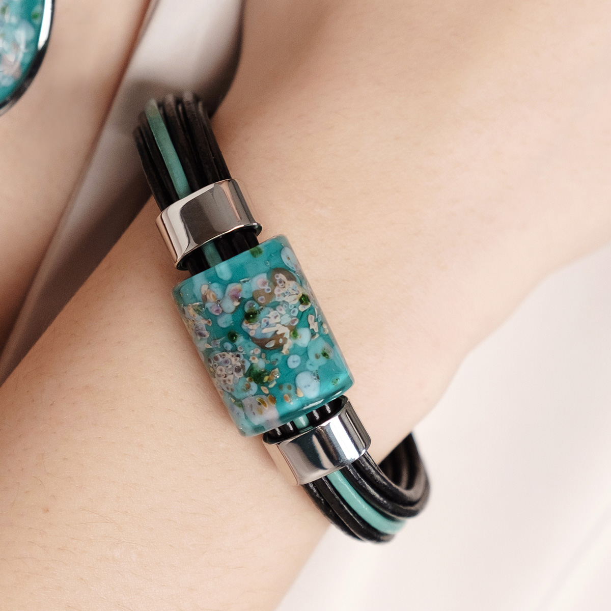 Браслет изготовлен из муранского стекла, натуральной кожи и гипоаллергенной ювелирной стали, что очень важно для людей с чувствительной кожей. Металл не темнеет и не подвергается воздействиям окружающей среды, надолго обеспечивая красивый внешний вид изделия. Крепкий магнитный замок с двойной защитой надежно фиксируется на запястье. Ширина браслета - 1,5 см. Размер стеклянной бусины - 1,9*2,5 см. Вес - 36 гр.