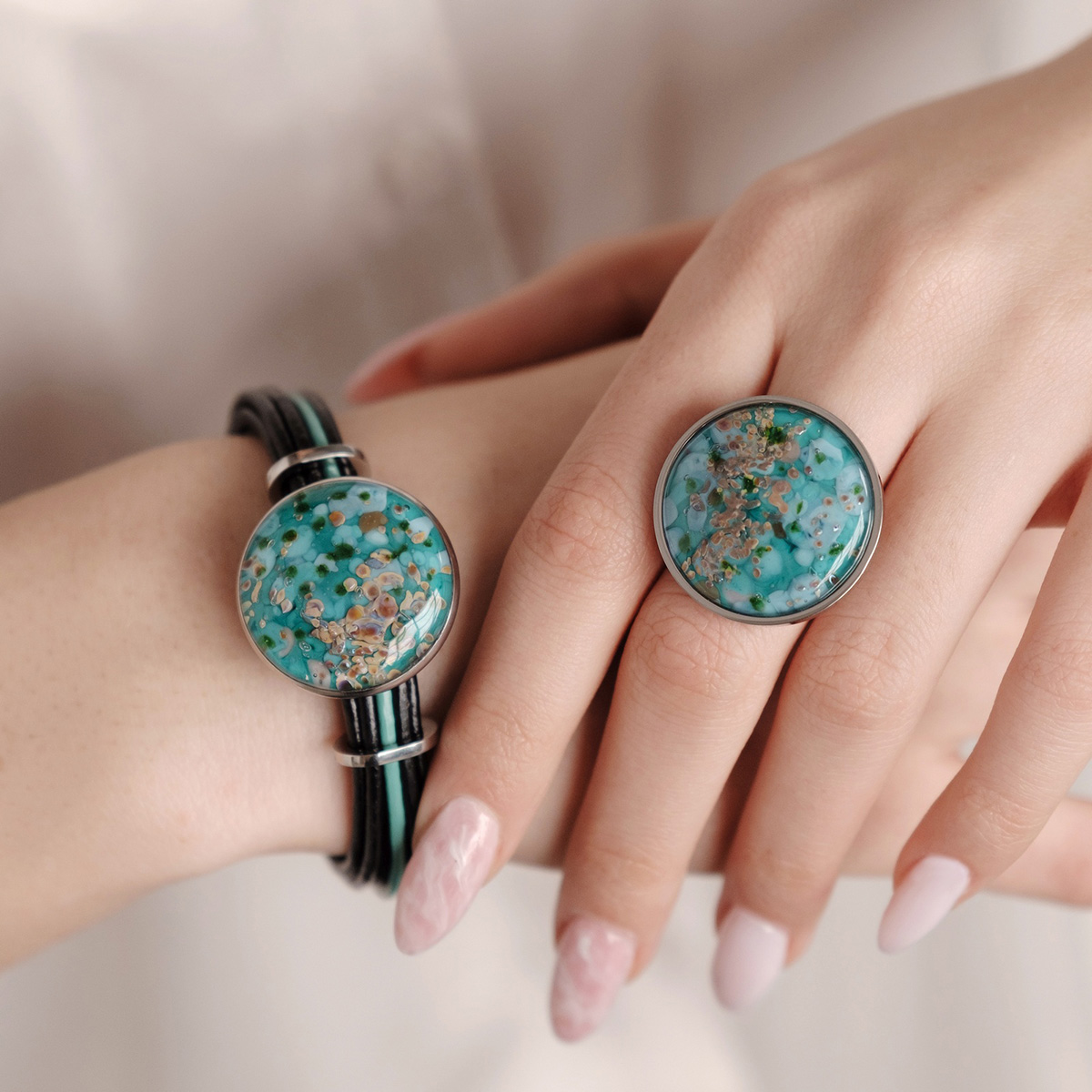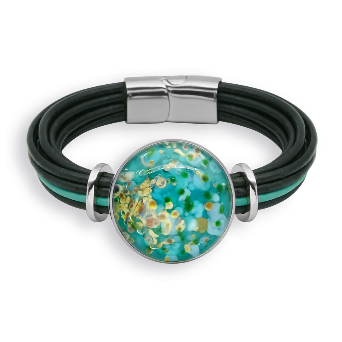 Браслет изготовлен из муранского стекла, натуральной кожи и гипоаллергенной ювелирной стали, что очень важно для людей с чувствительной кожей. Металл не темнеет и не подвергается воздействиям окружающей среды, надолго обеспечивая красивый внешний вид изделия. Крепкий магнитный замок с двойной защитой надежно фиксируется на запястье. Ширина браслета - 1,5 см. Диаметр стеклянного элемента - 2,5 см. Вес - 24 гр.