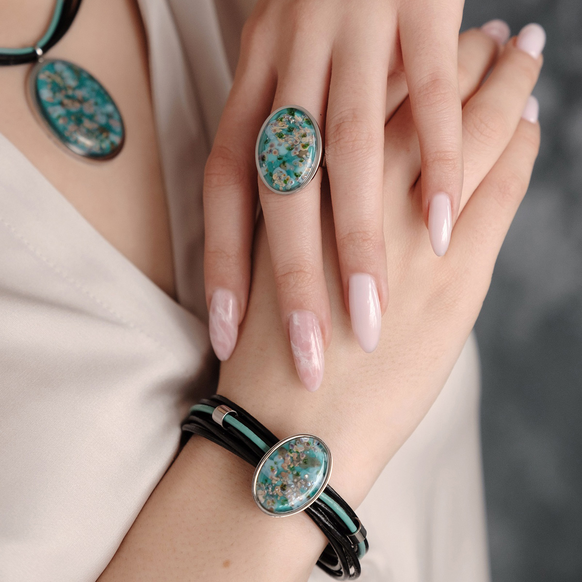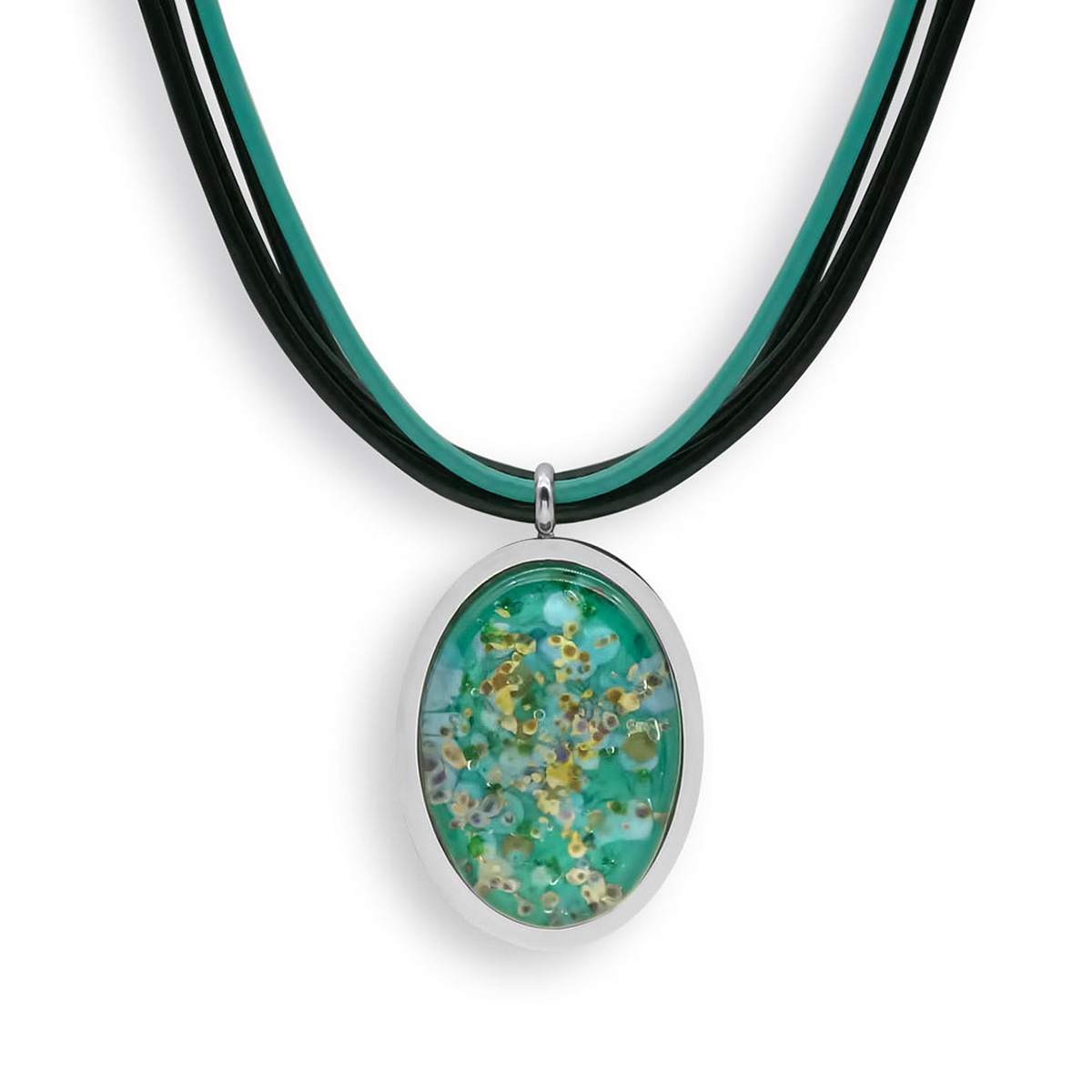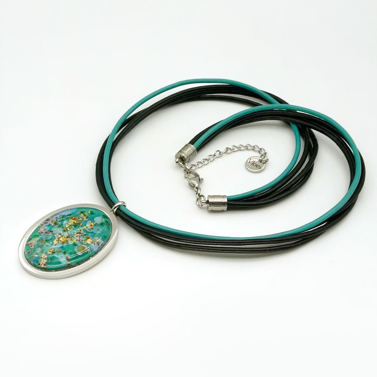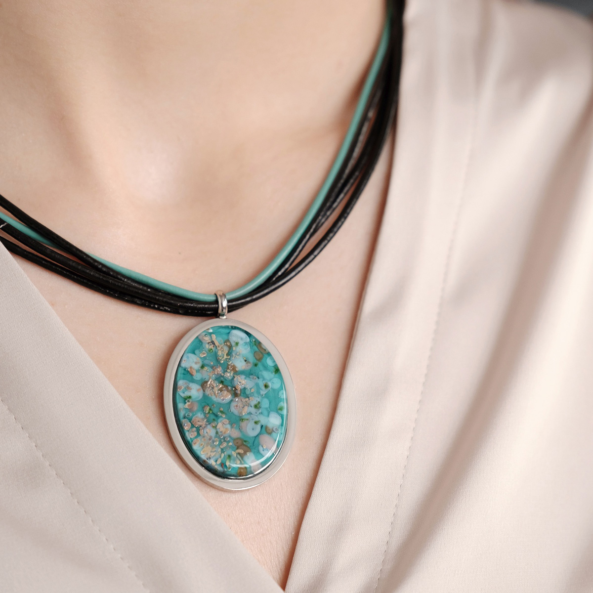 Колье изготовлено из натуральной кожи, муранского стекла и гипоаллергенной ювелирной стали, что очень важно для людей с чувствительной кожей. Металл не темнеет и не подвергается воздействиям окружающей среды, надолго обеспечивая красивый внешний вид изделия. Длина колье - 46 см + 5 см. удлиняющая цепочка. Размер стеклянного элемента - 4х3 см. Вес - 26 гр.