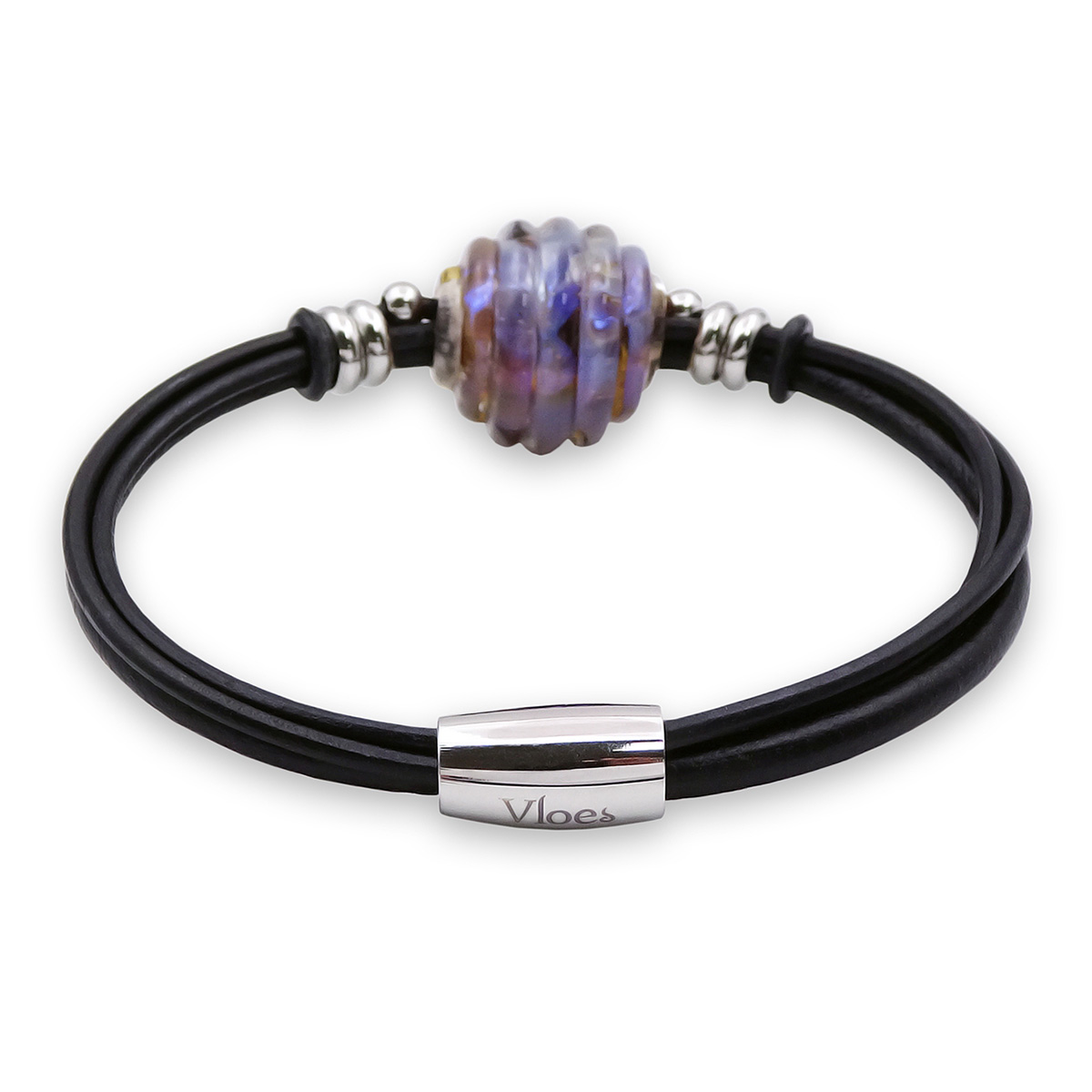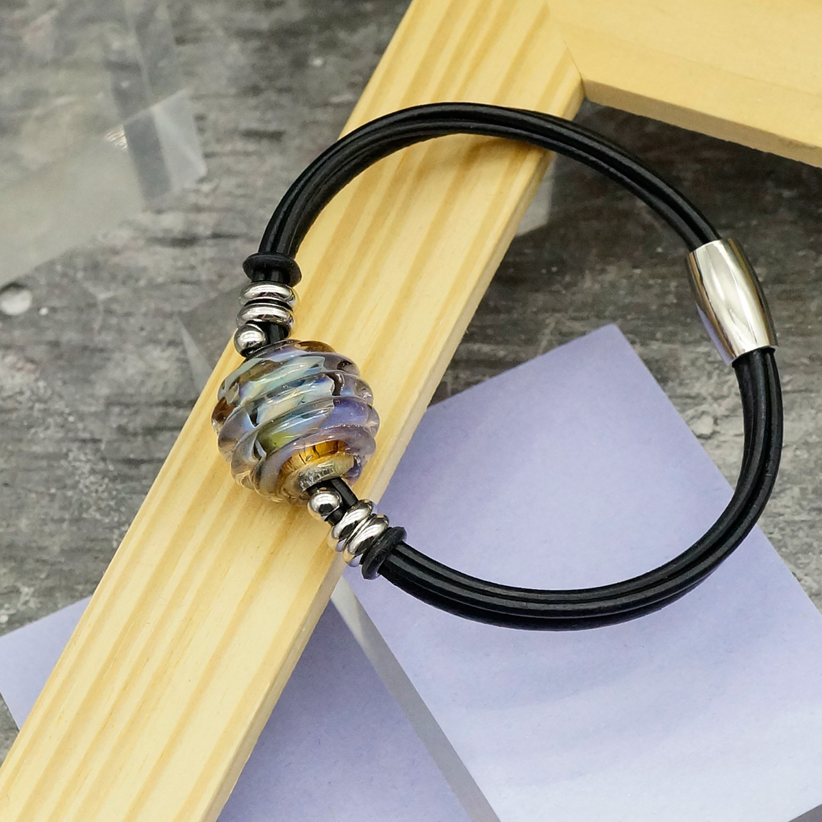 Браслет изготовлен из муранского стекла, натуральной кожи и гипоаллергенной ювелирной стали, что очень важно для людей с чувствительной кожей. Металл не темнеет и не подвергается воздействиям окружающей среды, надолго обеспечивая красивый внешний вид изделия. Крепкий магнитный замок надежно фиксируется на запястье. Ширина браслета - 0,5 см. Диаметр стеклянного шара 1,8 см.   Вес - 14 гр.