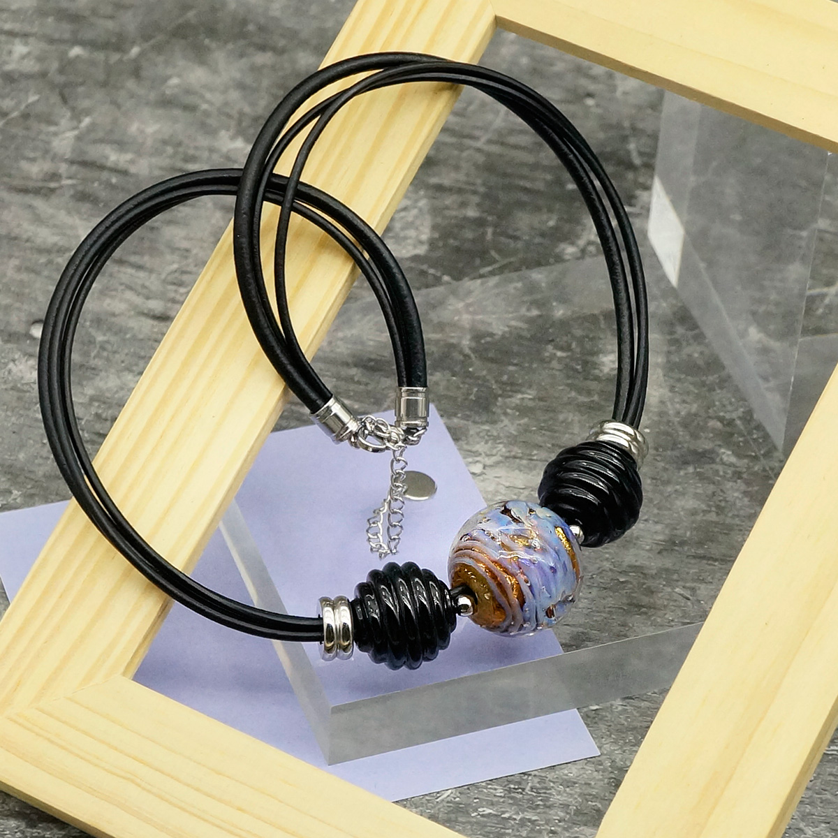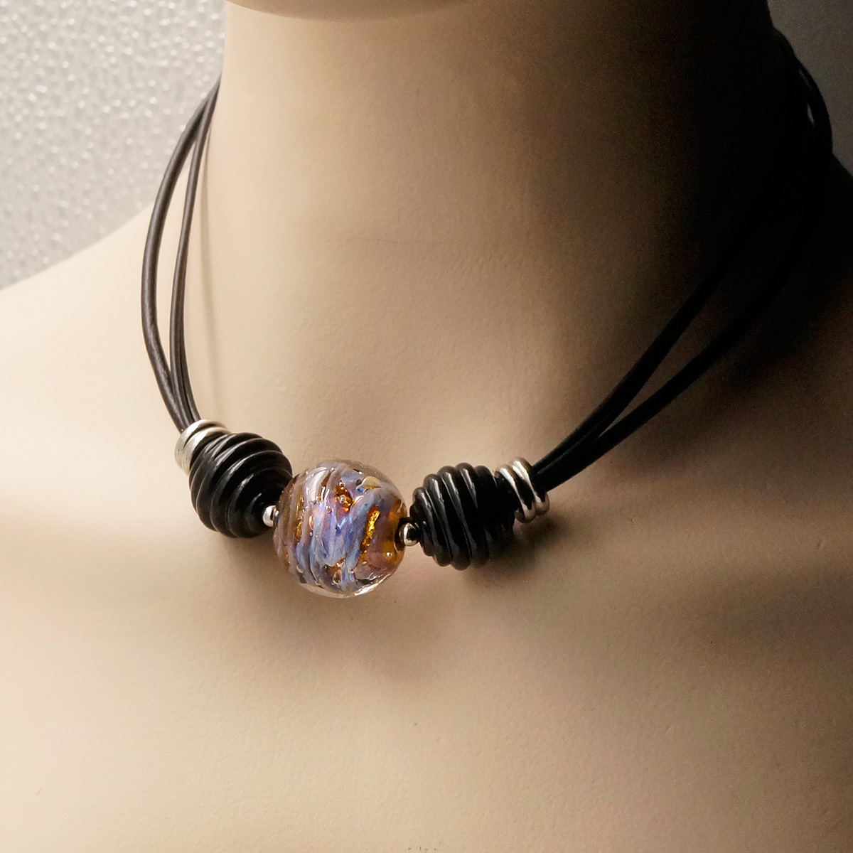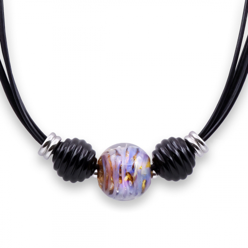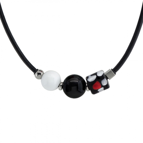 Колье изготовлено из натуральной кожи, муранского стекла и гипоаллергенной ювелирной стали, что очень важно для людей с чувствительной кожей. Металл не темнеет и не подвергается воздействиям окружающей среды, надолго обеспечивая красивый внешний вид изделия. Длина колье - 46 см + 5 см. удлиняющая цепочка. Диаметр стеклянных шаров - 1,8 и 2,2 см. Вес - 43 гр.