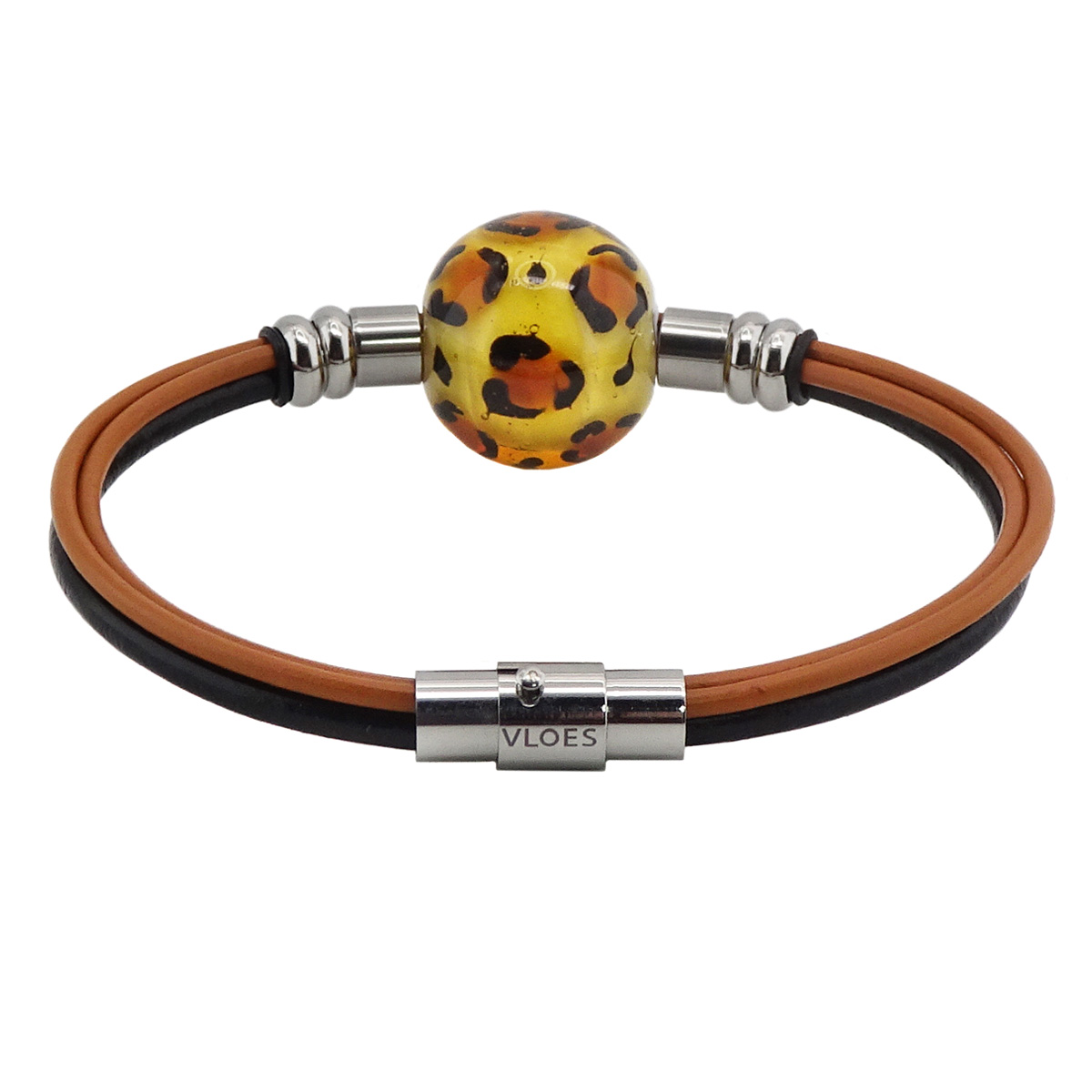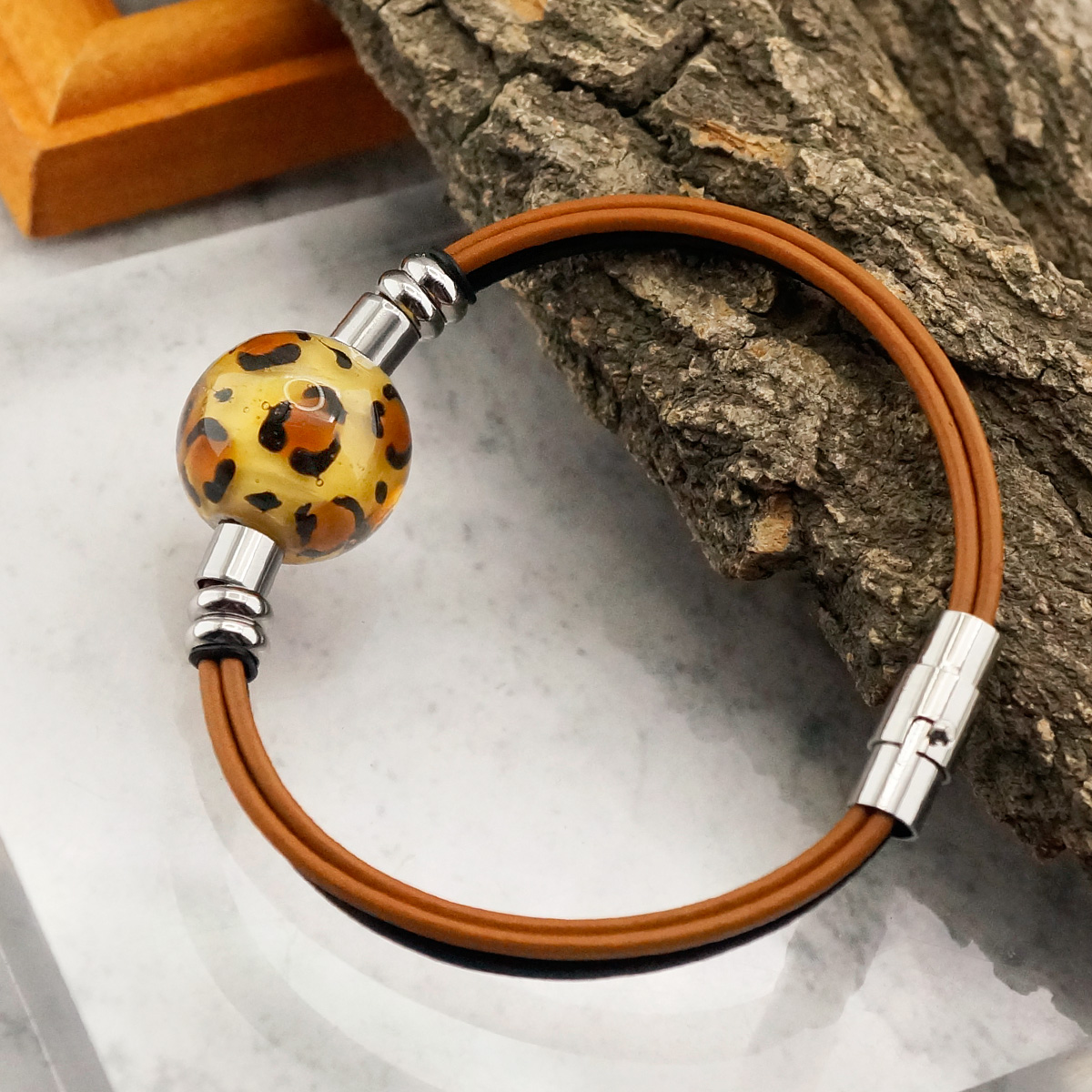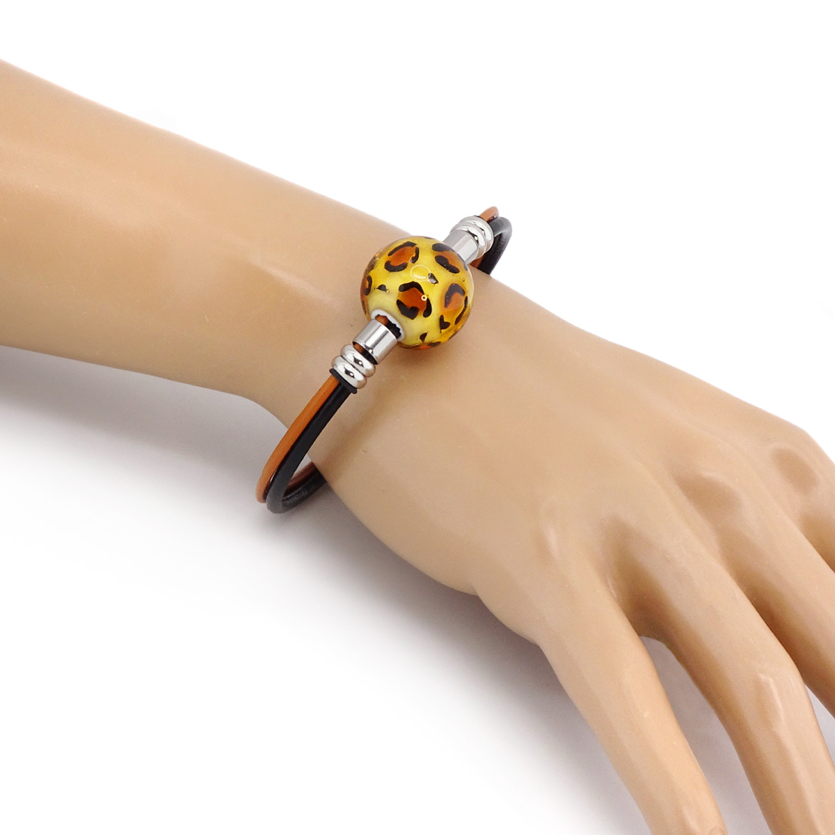 Браслет изготовлен из муранского стекла, натуральной кожи и гипоаллергенной ювелирной стали, что очень важно для людей с чувствительной кожей. Металл не темнеет и не подвергается воздействиям окружающей среды, надолго обеспечивая красивый внешний вид изделия. Крепкий магнитный замок надежно фиксируется на запястье. Ширина браслета - 0,5 см. Диаметр стеклянного шара - 1,8 см. Вес - 15 гр.