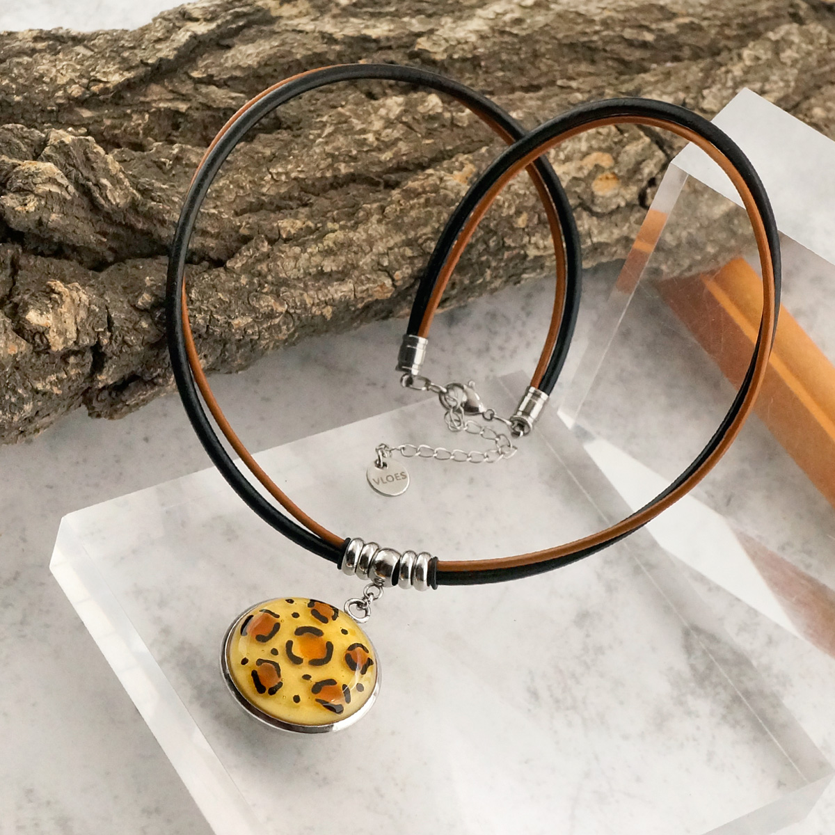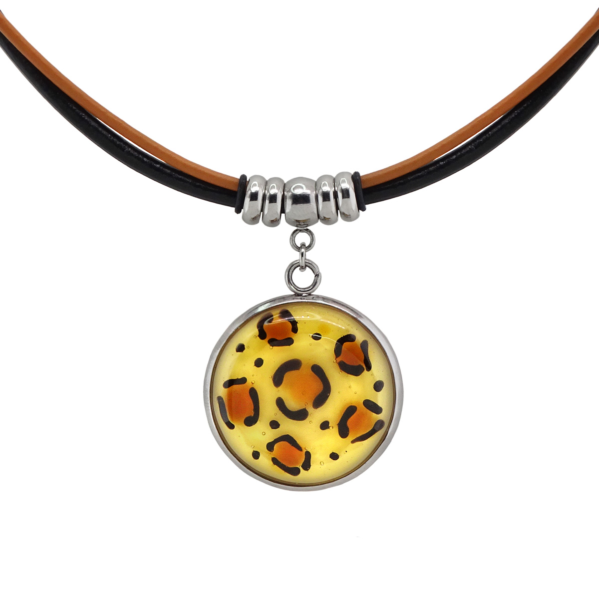 Колье изготовлено из натуральной кожи, муранского стекла и гипоаллергенной ювелирной стали, что очень важно для людей с чувствительной кожей. Металл не темнеет и не подвергается воздействиям окружающей среды, надолго обеспечивая красивый внешний вид изделия. Длина колье - 46 см + 5 см. удлиняющая цепочка. Диаметр стеклянного элемента - 2,5 см. Вес - 14 гр.