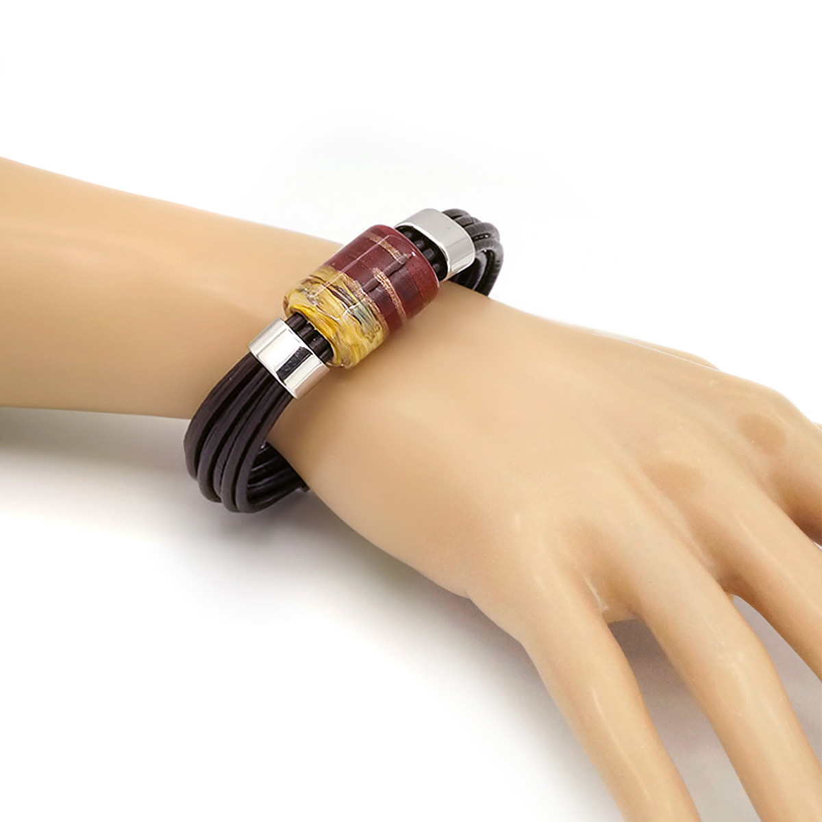 Браслет изготовлен из муранского стекла, натуральной кожи и гипоаллергенной ювелирной стали, что очень важно для людей с чувствительной кожей. Металл не темнеет и не подвергается воздействиям окружающей среды, надолго обеспечивая красивый внешний вид изделия. Крепкий магнитный замок с двойной защитой надежно фиксируется на запястье. Ширина браслета - 1,5 см. Размер стеклянной бусины - 1,9x2,5 см. Вес - 33 гр.