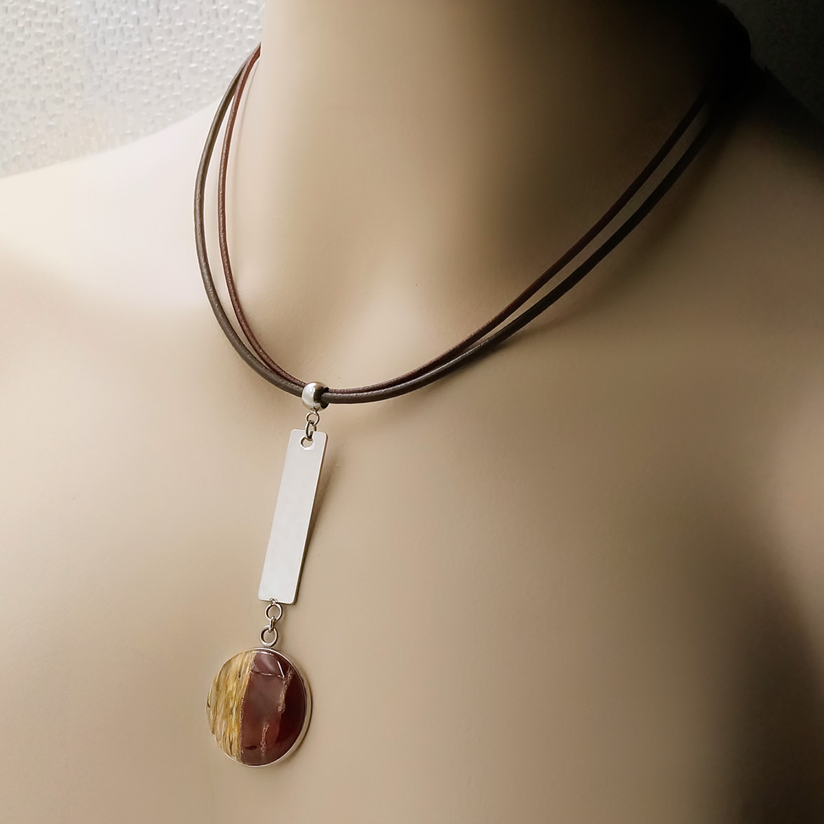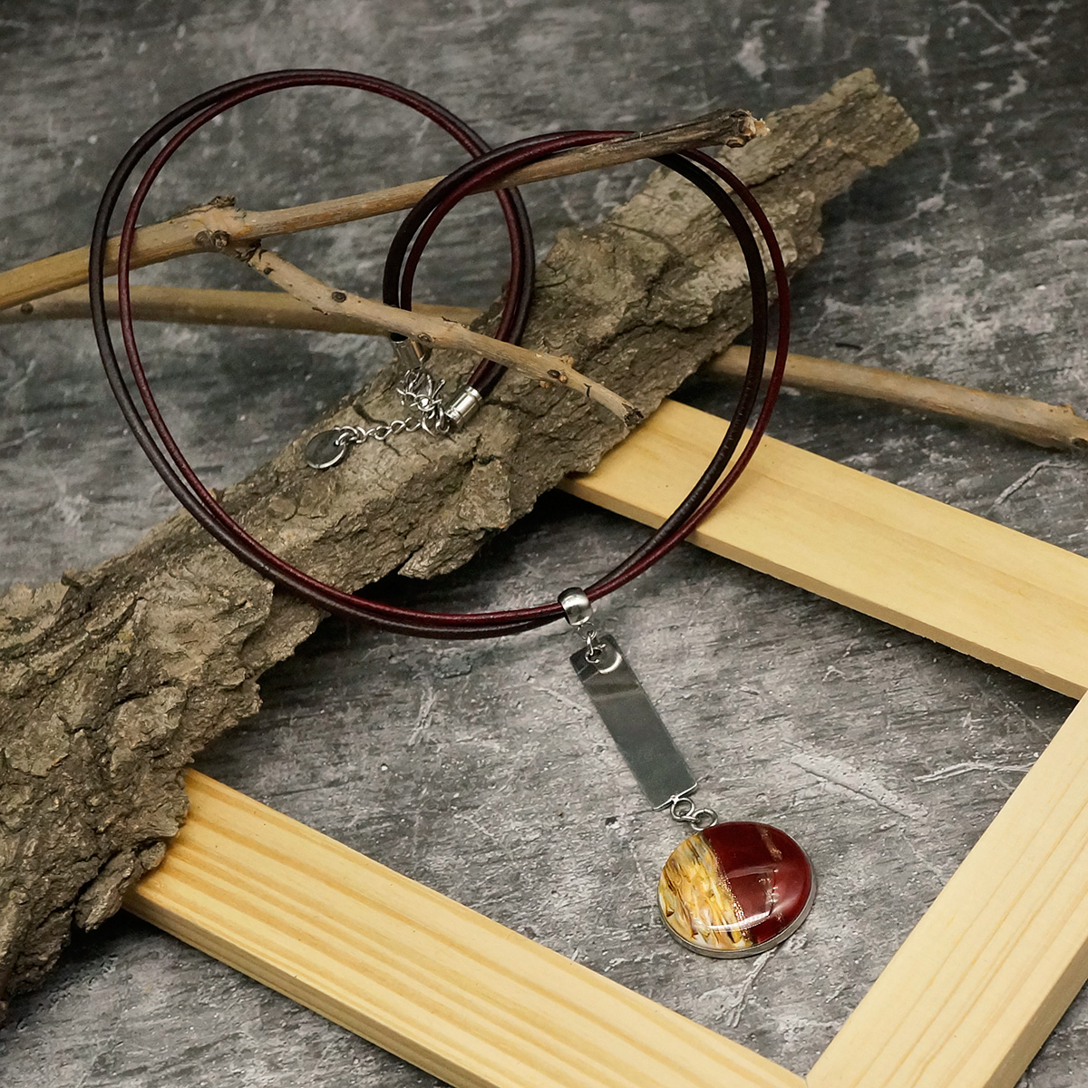 Колье изготовлено из натуральной кожи, муранского стекла и гипоаллергенной ювелирной стали, что очень важно для людей с чувствительной кожей. Металл не темнеет и не подвергается воздействиям окружающей среды, надолго обеспечивая красивый внешний вид изделия.  Длина колье - 46 см + 5 см. удлиняющая цепочка. Длина кулона - 7 см. Диаметр стеклянного элемента - 2,5 см.  Вес - 16 гр.
