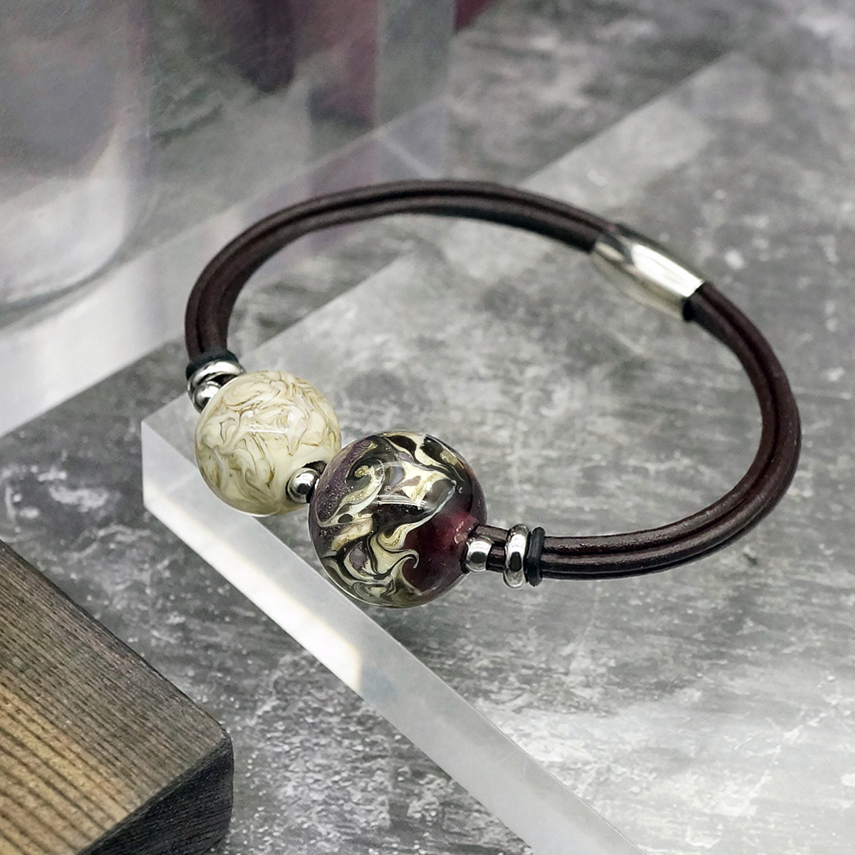 Браслет изготовлен из муранского стекла, натуральной кожи и гипоаллергенной ювелирной стали, что очень важно для людей с чувствительной кожей. Металл не темнеет и не подвергается воздействиям окружающей среды, надолго обеспечивая красивый внешний вид изделия. Размер стеклянных бусин - 1,8 и 1,5 см. Вес -  15гр.