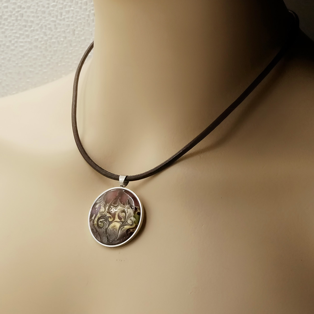 Колье изготовлено из натуральной кожи, муранского стекла и гипоаллергенной ювелирной стали, что очень важно для людей с чувствительной кожей. Металл не темнеет и не подвергается воздействиям окружающей среды, надолго обеспечивая красивый внешний вид изделия. Длина колье - 46 см + 5 см. удлиняющая цепочка. Диаметр стеклянного элемента - 3 см. Вес - 25 гр.