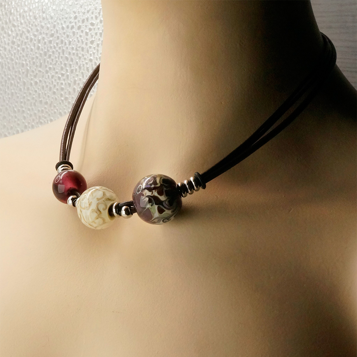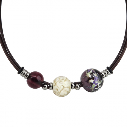 Колье изготовлено из натуральной кожи, муранского стекла и гипоаллергенной ювелирной стали, что очень важно для людей с чувствительной кожей. Металл не темнеет и не подвергается воздействиям окружающей среды, надолго обеспечивая красивый внешний вид изделия. Длина колье - 46 см + 5 см. удлиняющая цепочка. Диаметр стеклянных шаров - 1,5, 1,8 и 2,2 см. Вес -  гр.
