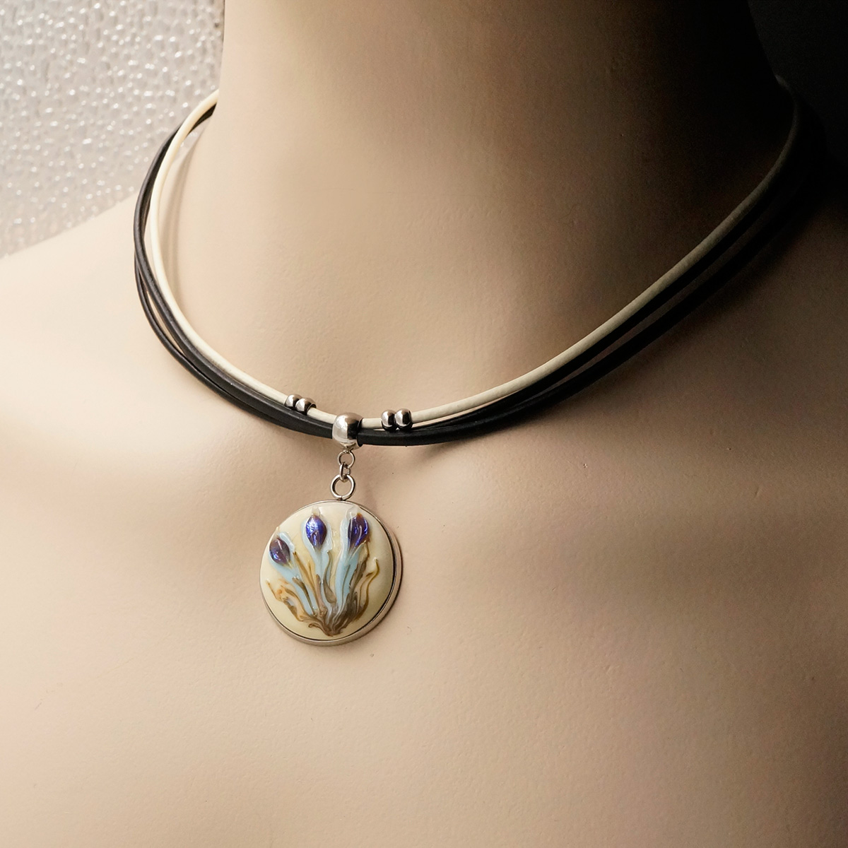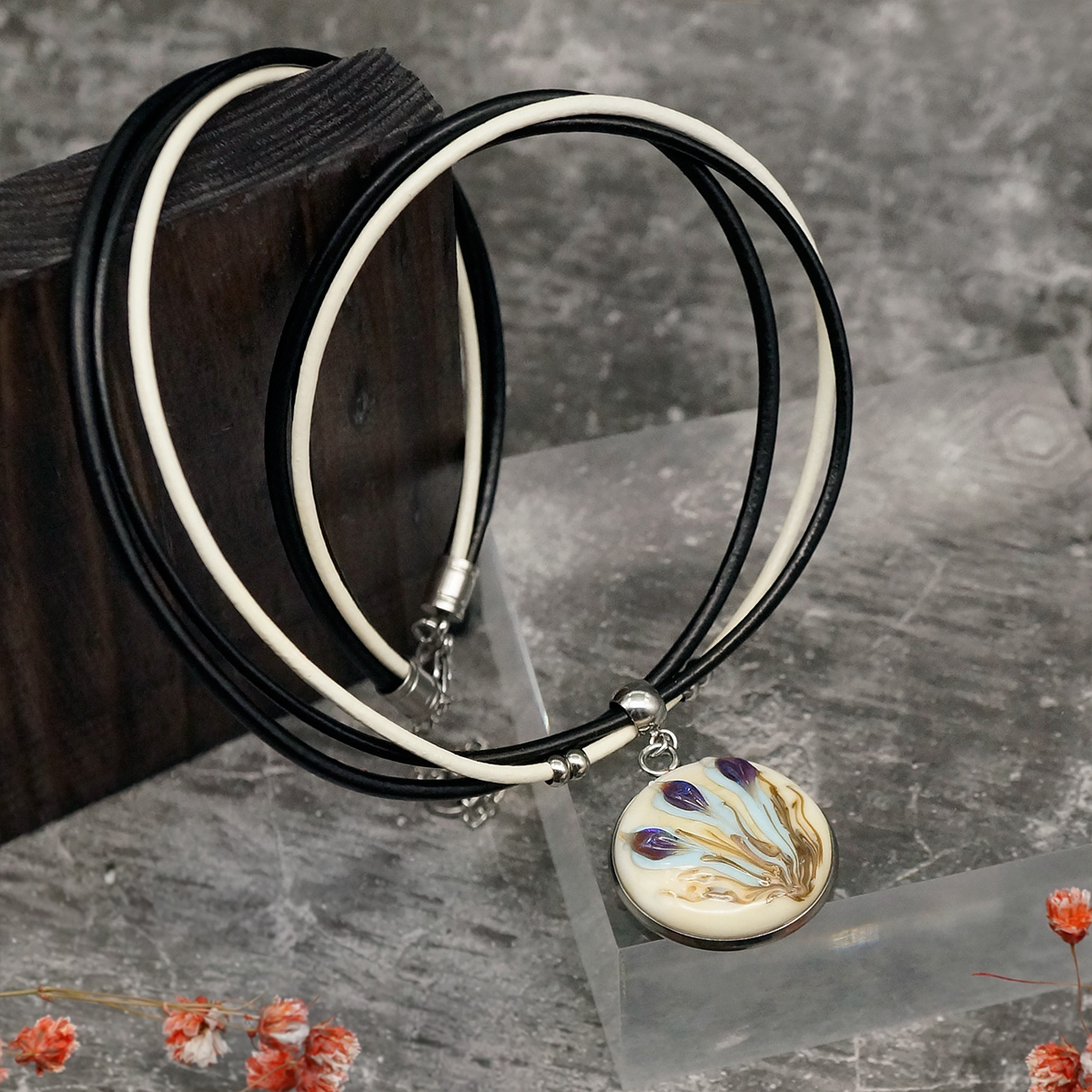 Колье изготовлено из натуральной кожи, муранского стекла и гипоаллергенной ювелирной стали, что очень важно для людей с чувствительной кожей. Металл не темнеет и не подвергается воздействиям окружающей среды, надолго обеспечивая красивый внешний вид изделия. Длина колье - 46 см + 5 см. удлиняющая цепочка. Диаметр стеклянного элемента - 2,5 см. Вес - 15 гр.