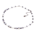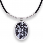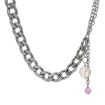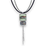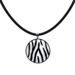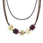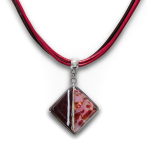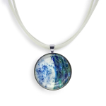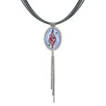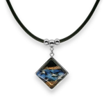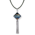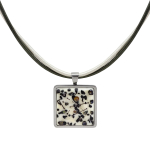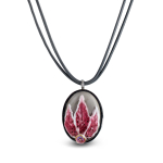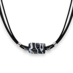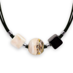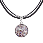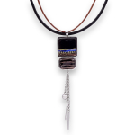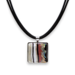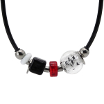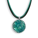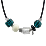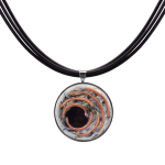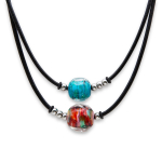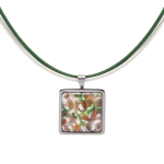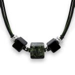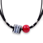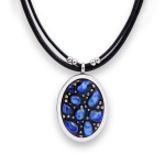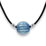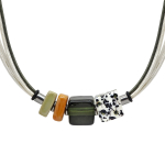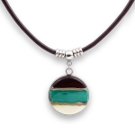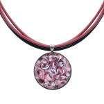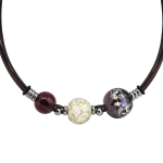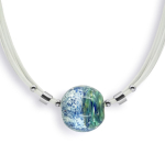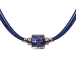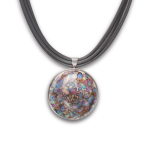 Колье изготовлено из натуральной кожи, муранского стекла и гипоаллергенной ювелирной стали, что очень важно для людей с чувствительной кожей. Металл не темнеет и не подвергается воздействиям окружающей среды, надолго обеспечивая красивый внешний вид изделия. Длина колье - 46 см + 5 см. удлиняющая цепочка. Диаметр стеклянного элемента - 3 см. Вес - 22 гр.